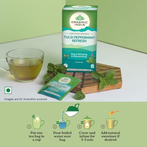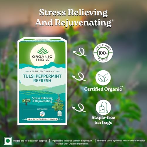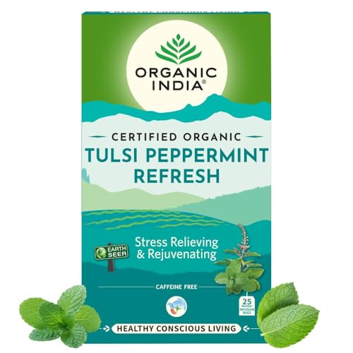 ORGANIC INDIA Tulsi Peppermint Refresh 25 Tea Bags || Stress Relieving & Rejuvenating || Feeling Refreshed || Tulsi Tea - 25 Tea Bags