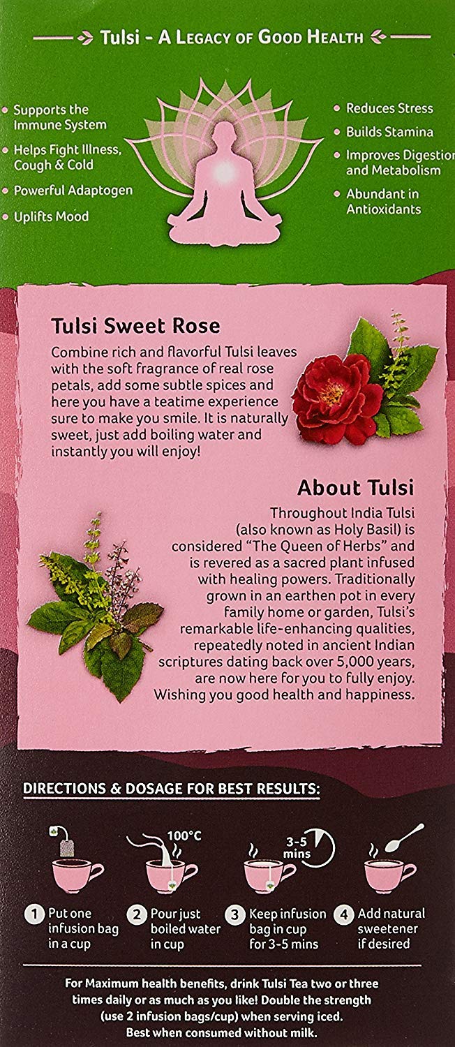Savour the Enchantment of Tulsi Sweet Rose Tea: Immerse yourself in the luxurious embrace of our Tulsi Sweet Rose Tea a harmonious blend that intertwines the rich essence of Tulsi leaves with the intoxicating aroma of fresh rosesThis exquisite herbal infusion is delicately accented with the sweetness of chamomile and the refreshing zest of lemongrass crafting a tea experience that revitalizes and refreshes with every sipOur unique blend not only delights the senses but also serves as a potent immunity booster harnessing the natural benefits of Tulsi and rose to enhance your well-beingRenowned for its stress-relieving properties this tea aids in reducing inflammation and promoting a radiant glow making it a perfect addition to your wellness routineIdeal for those seeking to enrich their tea collection with a tea that offers both exquisite taste and therapeutic benefits.