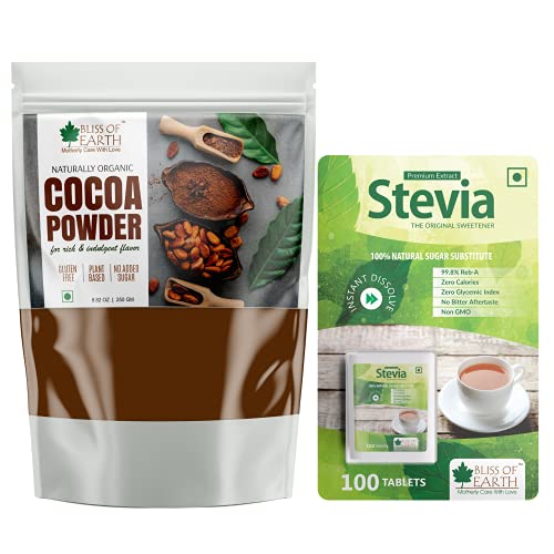 Bliss of Earth Naturally Organic Cocoa Powder is the perfect companion to any health concious kitchen. From holiday desserts and everyday baking to a steaming cup of cocoa on those chilli mornigs our cocoa powder offers a guil-free way to satisfy your sweet tooth without the high amount of sugar fat and preservatives which are commonly available in other mixes. In addition to its rich and indulgent flavor it is non-alkalinized and also has naturally occuring cocoa flavonols (polyphenols). Ever found yourself drowned in guilt for gorging in cuisines as sweet as saccharine? Unable to cut down on your love for all things sweet? Hereothe solution: Stevia! The name given to a green leafy herbal plant which is indigenous to South America and has been used for hundreds of years courtesy its extremely sweet leaves Stevia is at least 40 times sweet than regular sugar. However it has a perk your eyeballs would pop out on knowing: Stevia unlike sugar does not affect blood sugar levels! Hailed not only for its unbelievable ability to regulate blood sugar levels (hence an apt choice for those bearing the brunt of diabetes) but also to regulate blood pressure Stevia is catching up steam promptly in the health food circles. Inclusion of Stevia leaves as a part of oneodiet helps in dialling down bad LDL cholesterol and triglyceride levels and increasing HDL cholesterol levels which is healthy cholesterol. All in all spells great news for health buffs. And when we eat healthy our skin is bound to showcase all the goodness gushing inside. Steviaoinclusion overtime helps ease conditions such as eczema dermatitis etc. thus ringing in cheer for your aesthetics too! Bliss of EarthoOrganic Stevia powder packs all things salubrious for your long term health vitality and well-being. Give yourself a taste of it uninhibitedly!
