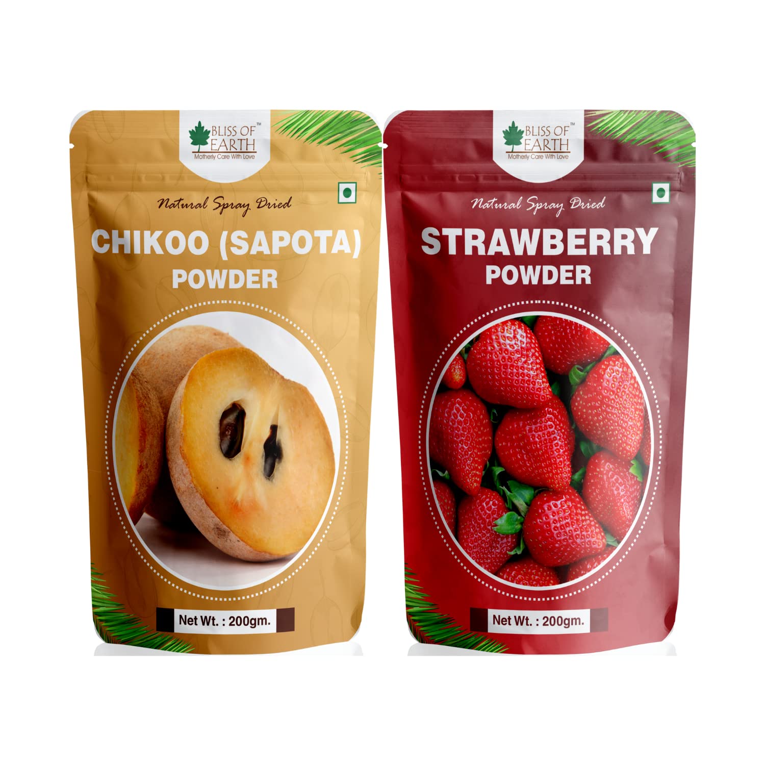 Bliss of Earth Chikoo powder is derived from the nutrient rich chikoos (sapota) by spray drying method. it is full of vitamin AE & C which are great for overall health. The sapodilla also known as sapota is a popular fruit and is celebrated for its taste. from giving a boost to your immunity to fighting many bacterial infection chikoo is the superhero of fruits.Bliss of Earth Strawberry Powder is derived from fresh spray dried strawberries. these are a great source for antioxidants that help your body. these protective nutrients may help lower cholesterol levels and reduce the risk of cardiovascular disease. strawberry powder is also rich in calcium vitamin k potassium and manganese all of which help build and maintain strong bones. strawberry powder can add a naturally sweet strawberry taste and rich nutrient boost to a variety of foods and drinks.