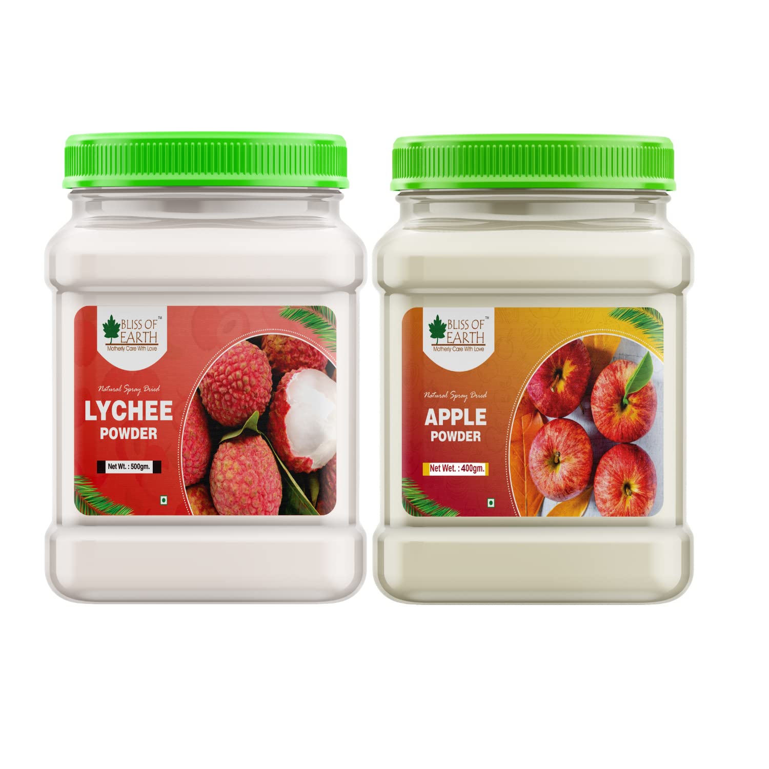 Bliss of earth lychee of litchi powder is derived from the fresh juicy litchi fruits by spray drying method. its fresh pulp is aromatic and musky in flavor and dried powder has the same sweet taste. Lychee is a reich source of nutrients and contains vitamin CB complex and phytonutrient flavonoids. It provides manganese magnesium copper iron and folate that are required for the RBC formation.Bliss of Earth Apple Powder is derived from juicy and nutrient rich apples by the spray drying method Apple powder is a light tan in color and is naturally sweet high in fiber and a rich source of antioxidant compounds known as polyphenols. Apples powder being low in sodium fat & cholesterol makes it an excellent natural sweetener with nutrition and fiber to add to your favorite recipes including breakfast cereals baked goods cake mixes pastries and desserts
