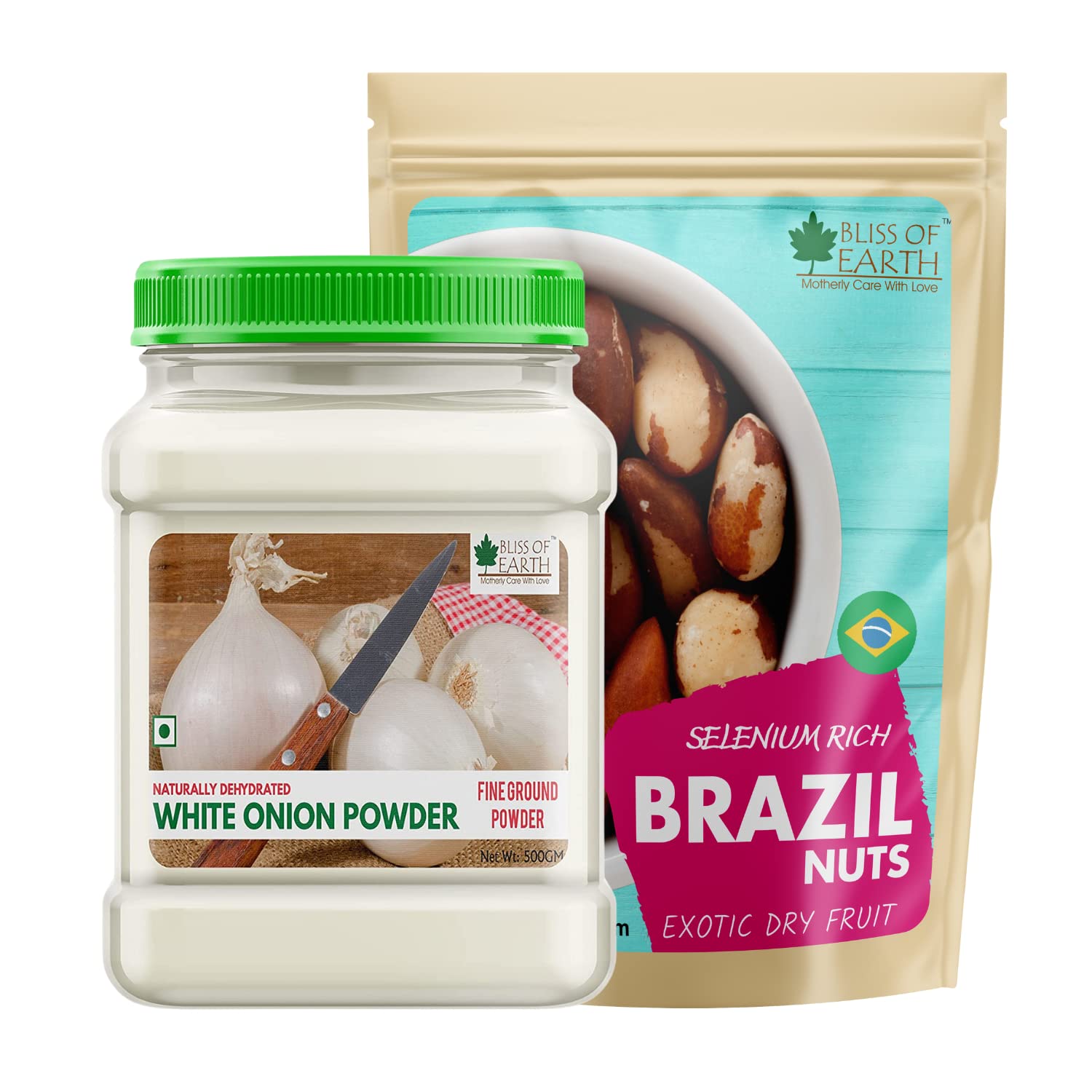Bliss of Earth Natural White Onion Powder is dehydrated ground onion that is most important culinary ingredients in every kitchen. Its characteristics strong flavour when raw makes it great addition on salad. Its sweet flavour when cooked is a key element for meats poultry seafood and all kind of side dishes. Bliss of Earth Brazil Nuts are nutritional powerhouse providing healthy fats vitamins and minerals. They are particularly high in selenium a mineral with potent antioxidant properties. Hazelnuts can be consumed as a raw snack roasted or added to baked dishes such as cake chocolates & shakes. All in all brazil nuts are an excellent and delicious source of nutrients for a healthy diet. Direction for use: Consume raw roasted or salted. Add to your cake chocolates or shakes.
