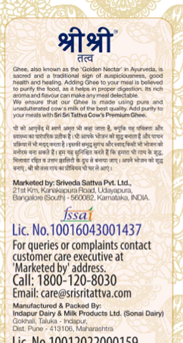 Thank God Sri Sri is providing excellent quality ghee. Don't ever reduce the quality. Price is little more but with offers it's fine. Bought for 800rs