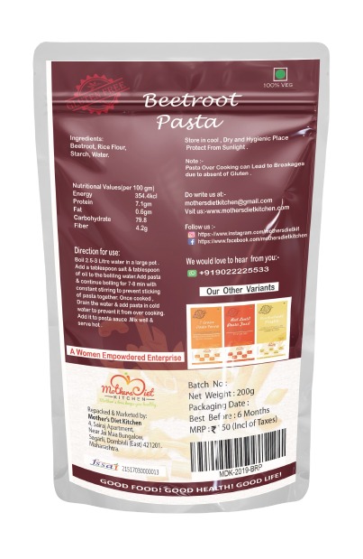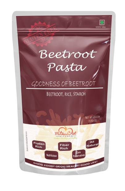 Beetroot pasta , a blend of beetroot and rice gives the benefits of both. While beetroot aids in lowering blood pressure and improving blood flow, rice gives an energy boost to the body. Beetroot is a high fibre vegetable. Beetroot has good content of iron in it and presence of copper in it makes iron accessible to our blood cells. Beetroot is a good source of Folic acid and Vitamin C.Brand : Mother's Diet KitchenIngredients : Corn, Amaranthus (Rajgira), Jowar, Bajra, Brown Rice, Black Rice, Bengal gramAllergen Information : Gluten FreePackage Information : Zip lock standup pouchCooking Instruction : Pasta over cooking may lead to breakages due to lack of Gluten....Storage Instruction : Store in cool, dry place away from sunlight and moisture to avoid risk of infestation. Best consumed withing 30-35 days of opening.