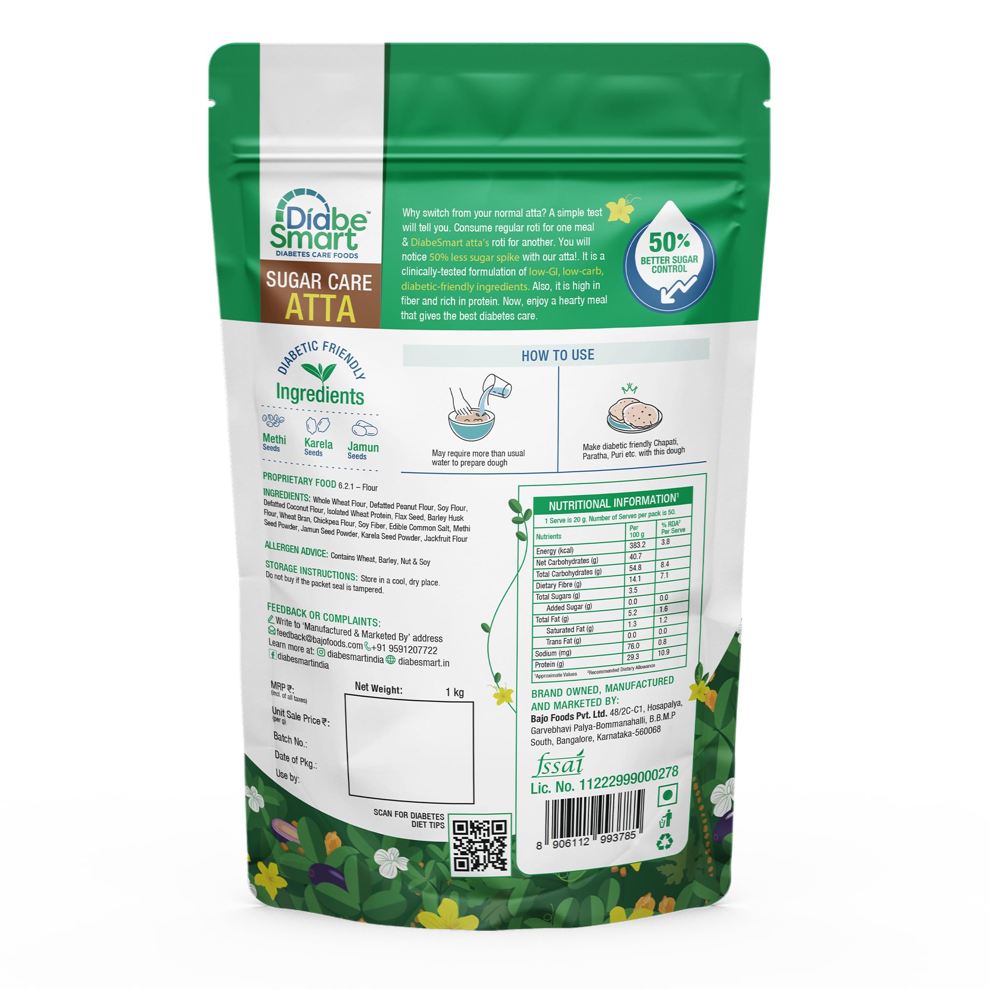Take control of your diabetes with our sugar-free low carb atta. Specially formulated for effective management it reduces glycemic load by 32% with slow sugar release. Made with quality ingredients it's a healthier choice for all your baking needs.