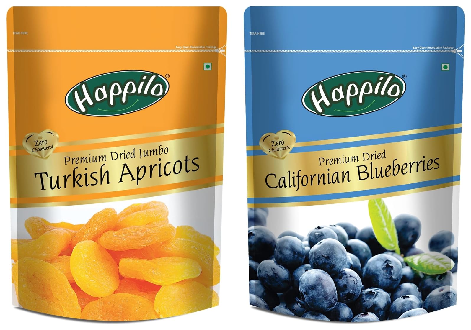 Happilo Premium Turkish Apricots 200gOur Jumbo dried apricots are plump moist chewy and vibrant in flavour! Larger apricots like this variety tend to be sweeter and more delicious.Happilo Premium Dried Californian Blueberries 150gBlueberries are slightly sweetened and ideal for snacking mixing in cereals or adding to cakes and muffins. Heart Healthy plump and sweet taste of our dried blueberries will leave your taste buds in paradise.