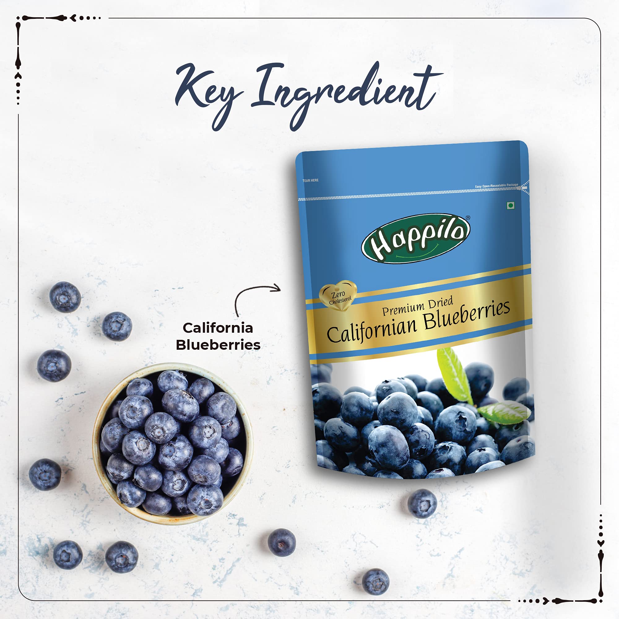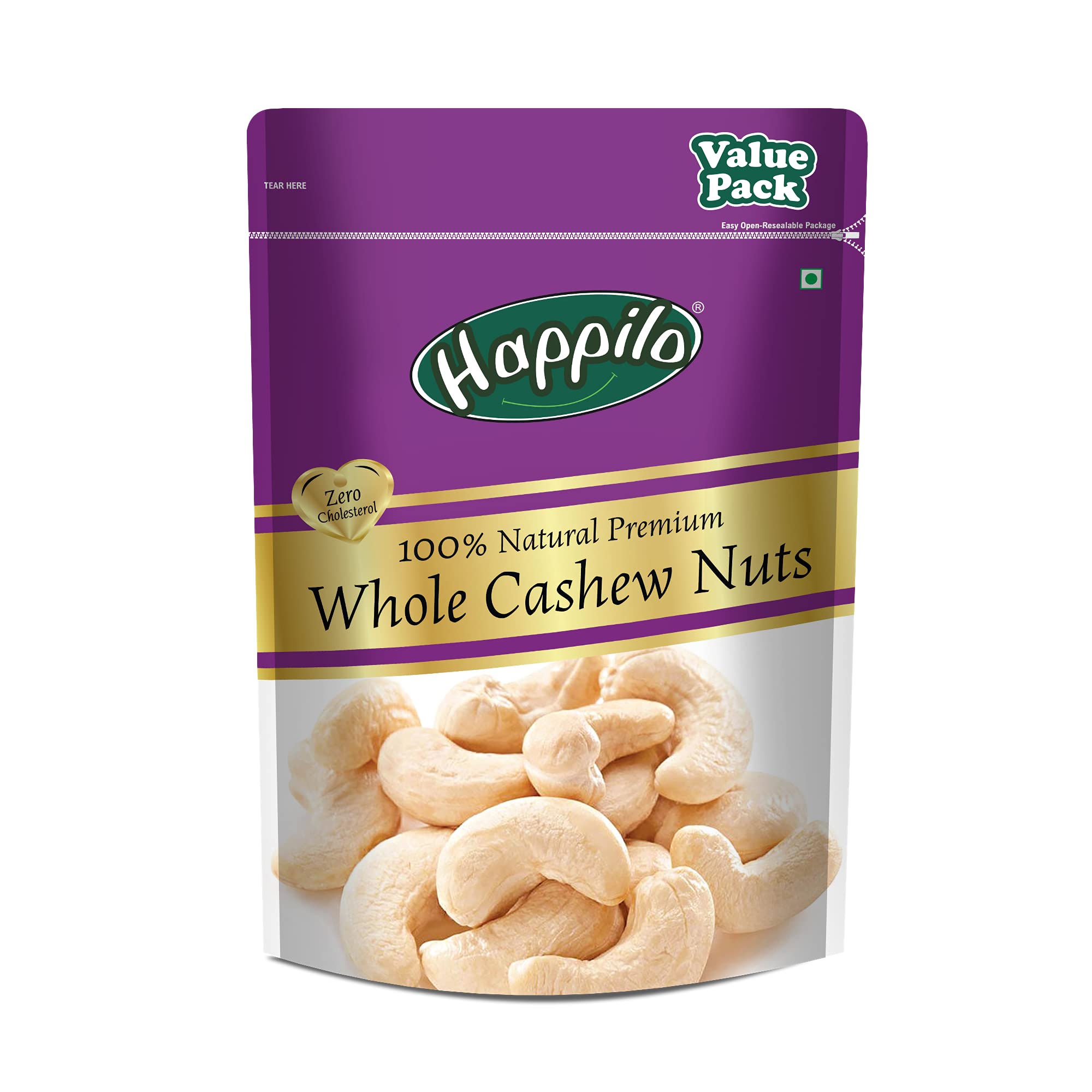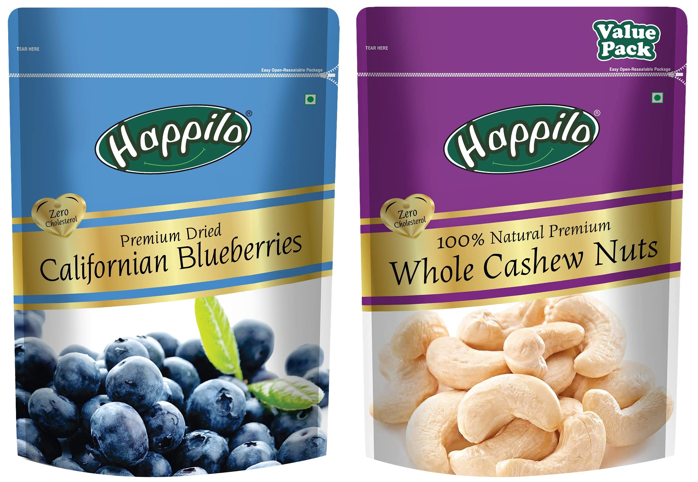 Happilo 100% Natural Premium Whole Cashews Value Pack Pouch 500 g Happilo has travelled the world to get the finest gourmet dry fruits Cashews are a real treat. These are the best nuts you can ever find. They are delightfully rich and tasty a nutritious treat that will make a great snack time. Happilo Premium Dried Californian Blueberries 150 g (Pack of 1) Happilo has travelled the world to get the finest gourmet dry fruits Dried Blueberries are the original candy- nature's candy. They are one of the most nutritious dried fruits in the world. famous for their sweetness so they're a yummy healthy snack. They have double the deliciousness of ordinary dried blueberries. Great for Snacking adding to Cereal Cooking and Baking. High Antioxidants Dietary Fiber No Gluten Non GMO Zero Trans Fat & Zero Cholesterol. Daily need products for a healthy and energetic life. Happilo Zip Lock Pouch with airtight seal to ensure the product is protected and fresh. Quality assured - Happilo products are rigorously tested against the industry's best quality standards.