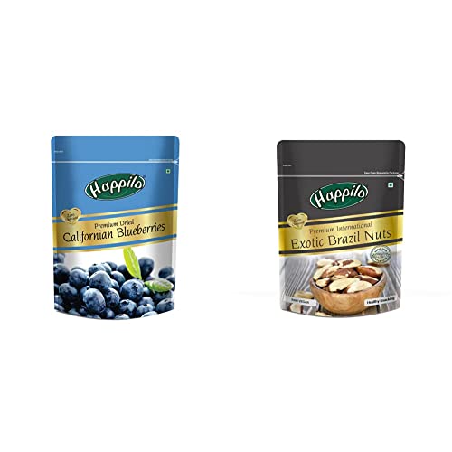 Happilo Premium Dried Californian Blueberries 150 g (Pack of 1)Happilo has travelled the world to get the finest gourmet dry fruits Dried Blueberries are the original candy- nature's candy. They are one of the most nutritious dried fruits in the world. famous for their sweetness so they're a yummy healthy snack. They have double the deliciousness of ordinary dried blueberries. Great for Snacking adding to Cereal Cooking and Baking. High Antioxidants Dietary Fiber No Gluten Non GMO Zero Trans Fat & Zero Cholesterol. Daily need products for a healthy and energetic life. Happilo Zip Lock Pouch with airtight seal to ensure the product is protected and fresh. Quality assured - Happilo products are rigorously tested against the industry's best quality standards.Happilo Premium International Exotic Brazil Nuts 150g Amazon/Brazilian Nut without Shell Healthy Crunchy Protein Snack 150 g (Pack of 1)Happilo has travelled the world to get the finest gourmet dry fruits dried fruits nuts berries and dates. Indulge into the gourmet and grocery world of Happily with awesome natural nuts and dry fruits along with the unique dry fruit mixes fusions and flavoured dry fruits healthy seeds and dried berries specially crafted for your taste and health.