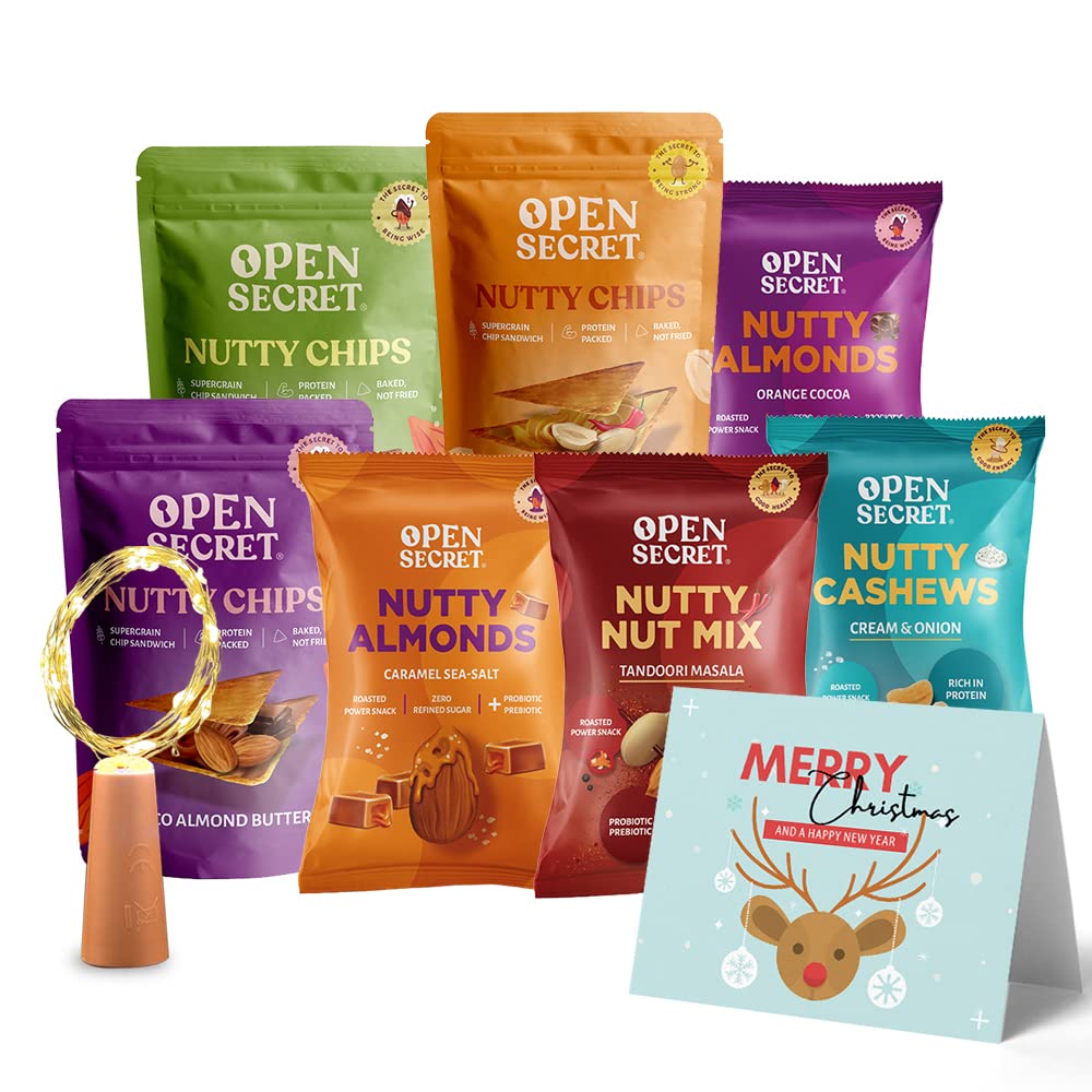 HomeGroceryNutsMixed Dried FruitsOpen Secret Sankranti Gifts| 3 Nutty Chips with 4 Mini Packs of Dry Fruits & Nuts | New year/Lohri/Makar/Pongal healthy Gift Items for kids friends family & colleagues