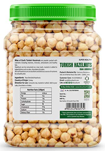 Bliss of Earth Turkish Hazelnuts are powder packed with nutrients including vitamins minerals anti-oxidants and healthy fats. Hazelnuts can be consumed as a raw snack roasted or added to baked dishes such as cake chocolates & shakes. All in all hazelnuts are an excellent and delicious source of nutrients for a healthy diet. Hazelnuts offers various health benefits including regulating blood pressure Direction for use: Consume raw roasted or salted. Add to your cake chocolates or shakes. Ingredients: Raw Dehulled Hazelnuts Country of Origin: Turkey