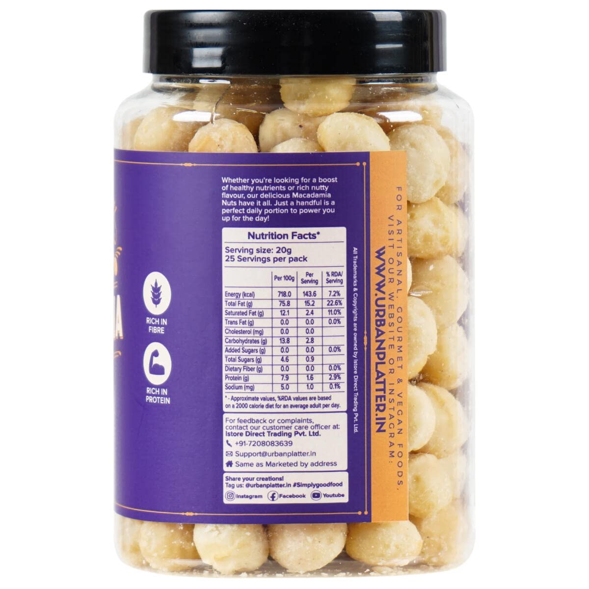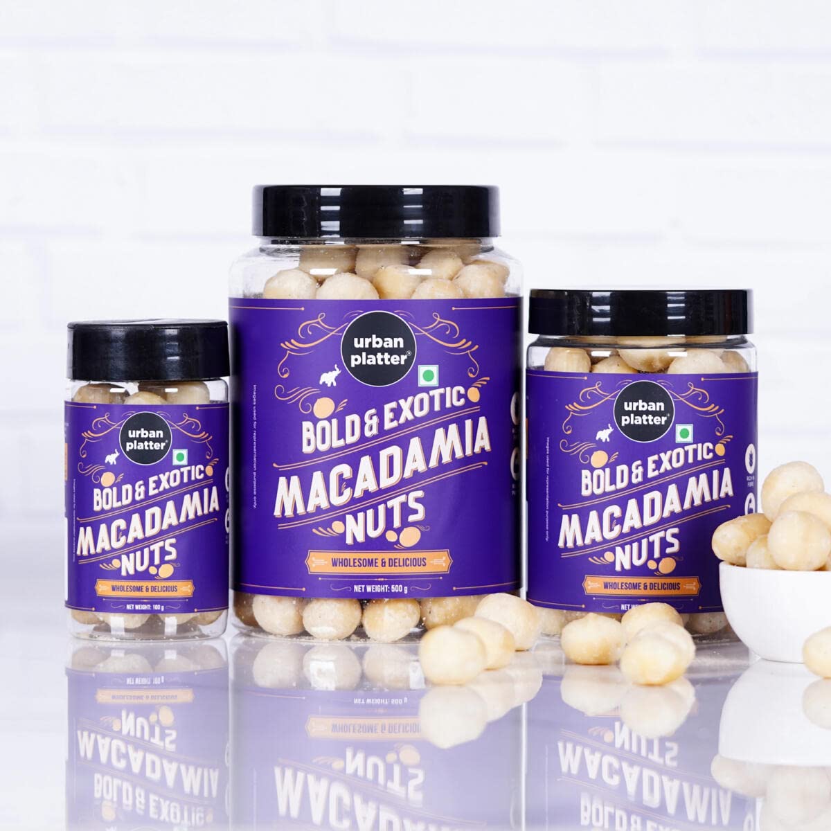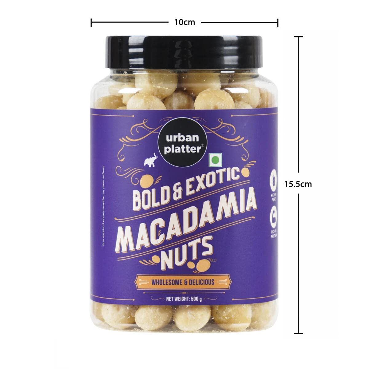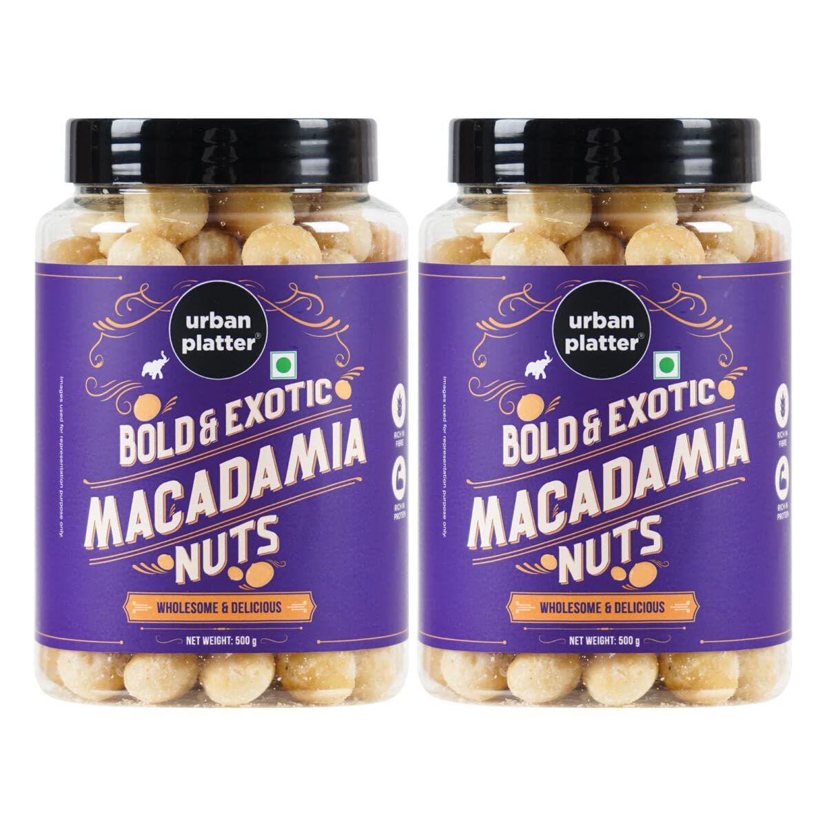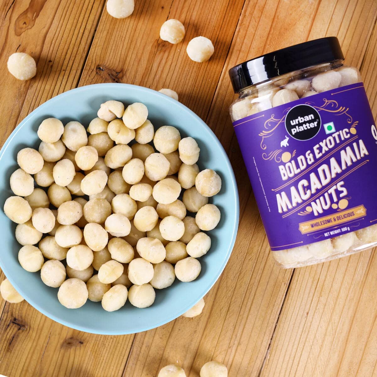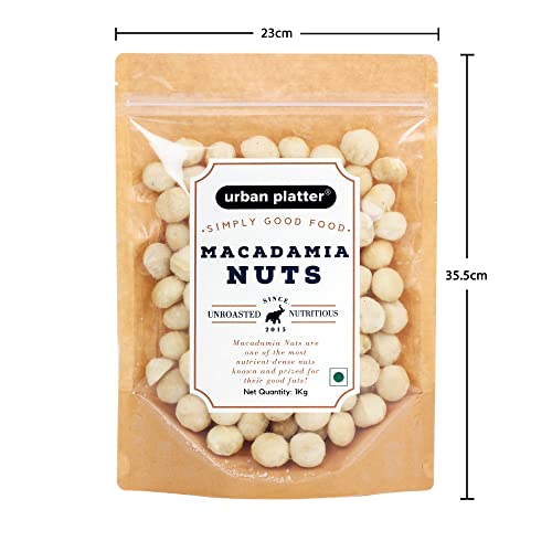 Urban Platter Bold and Exotic Macadamia Nuts 1kg (Grade A Premium Quality Crunchy perfect for guilt-free snacking)These nuts can be consumed as they are or with tea/ coffeeCan be roasted and salted to give oneself a delightful treat They have the highest amount of beneficial mono unsaturated fats of any known nut. Thus they are considered great for patients with hyperemia and You can dip them in chocolate sauce and freeze to get yummy chocolate flavored macadamia nuts Once opened refrigerate and use macadamia nuts within two months