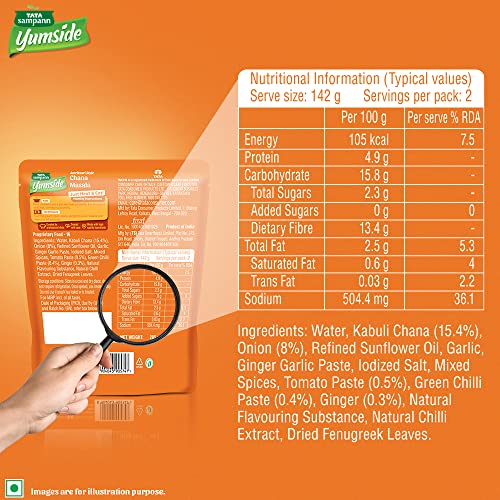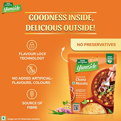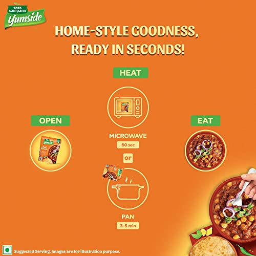 Try our range of YUM MEALS with home-style goodness! Cooking multiple dishes for your familys meal time with the right balance of flavours and taste can be a tedious and time-consuming task. Tata Sampann Yumside brings you a wide range of ready to eat meals to save you the hassle of cooking every dish from scratch. These instant meals from Tata Sampann Yumside let you spend extra time with your family while offering you the convenience of serving YUM Meals with Home-style Goodness! Tata Sampann Yumside Amritsari Style Chana Masala contains NO Preservatives NO added artificial colours & flavours and is made with high-quality ingredients. All you have to do is heat the pack in the microwave for 60 seconds or in boiling water for 3-5 minutes and your instant chana masala is ready to serve and eat! Storage instructions: Store in a cool and dry place does not require refrigeration (Crafted for room temperature storage and does not contain preservatives). Once opened use it immediately. Do not use it if the pouch has leaked or is bloated.
