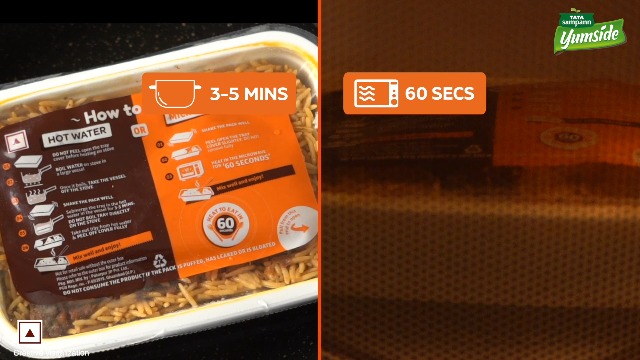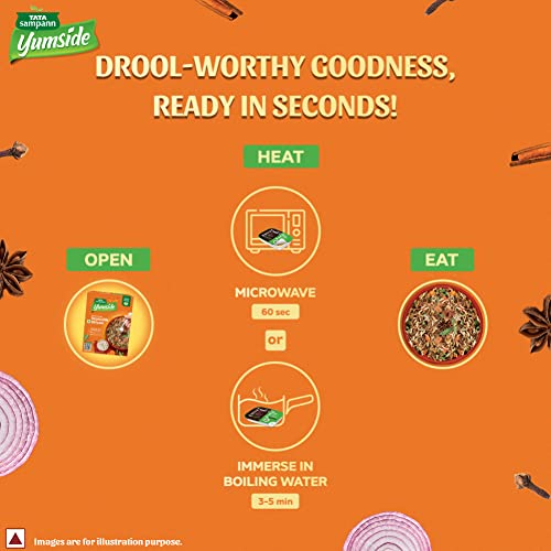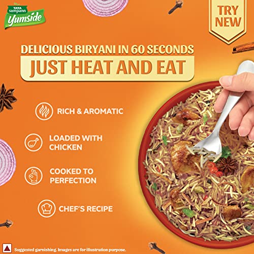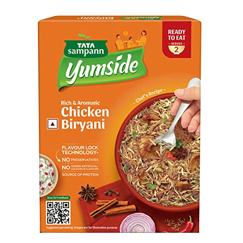 YUM MEAL WITH GOODNESS - An instant solution to your cravings! Looking for an instant and convenient way to kill those hunger pangs? Your search ends with Tata Sampann Yumside ready to eat meals which are made from high-quality ingredients and curated by professional chefs. Loaded with tender boneless chicken and cooked to perfection this rich & aromatic instant biryani will satisfy your Biryani cravings anytime! For times when you or your family crave something delicious for lazy days for treat days for days when you're running out of time for days when you just want to have more time for life! - This ready-to-eat meal comes to the rescue. All you have to do is heat the pack in the microwave for 60 seconds or immerse the tray in hot water for 3-5 mins and your instant meal is ready! Doesn't it sound great?! Enjoy a rich experience Tata Sampann Yumside ready-to-eat instant biryani is sealed with care using Flavour-Lock Technology with NO preservatives used Storage Instructions: Store in a cool and dry place. It does not require refrigeration. Consume immediately once the pack is opened. Do not consume if the inner pack is puffed bloated or leaked.