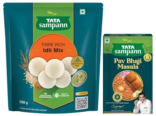 Tata Sampann Fibre Rich Idli Mix | Ready to Cook Breakfast Mix | Ready in 15 Minutes | Soft Fluffy & Tasty Idlis | Idli Batter | 500 gBid a delicious adieu to your hunger pangs! Breakfast time on a busy morning can be a real struggle. But a quick and tasty meal can really save the day. So turn your hectic mornings into a delicious affair with Tata Sampann. Bring home Tata Sampann ready to cook mixes for quick & delicious meal options and kick-start your day with deliciousness. These breakfast mixes are super easy to cook & super delicious in taste and offer a lip-smacking meal in just 15 minutes! Cook soft fluffy and steaming idlis at home with Tata Sampann Fibre Rich Idli Mix and indulge in yummy and fulfilling goodness. This idli batter is made with high-quality ingredients. It contains no added colours and preservatives making it a great choice for a wholesome meal. Be it a quick hunger fix when running late or an effortless lip-smacking meal on the weekend Tata Sampann instant idli batter mix can do it all. With this easy-to-make breakfast mix enjoy delicious idlis at your fingertips. Storage: Store in a cool and dry place. Do not purchase if the pack is open or tampered or punctured.Tata Sampann Pav Bhaji Masala with Natural Oils Crafted by Chef Sanjeev Kapoor 100gTata Sampann Pav Bhaji Masala is specially crafted for you by Chef Sanjeev Kapoor to unleash the master chef within you. Tata Sampann spices are made to retain their natural oils ensuring each bite is aromatic and flavorful. Each pack comes with an exclusive Chef Tip to make every meal exciting! Now make Bombay Style Pav Bhaji at home and watch everyone lick their plates clean! Explore Tata Sampann Blended Spices Range Chaat Masala Paneer Masala Chhole Masala Chicken Masala Dal Tadka Masala Meat Masala Kitchen King Masala and Garam Masala. Chefs Tip: Toss leftover rice with vegetables and some Pav Bhaji Masala to make a quick Bombaiya Pulao.