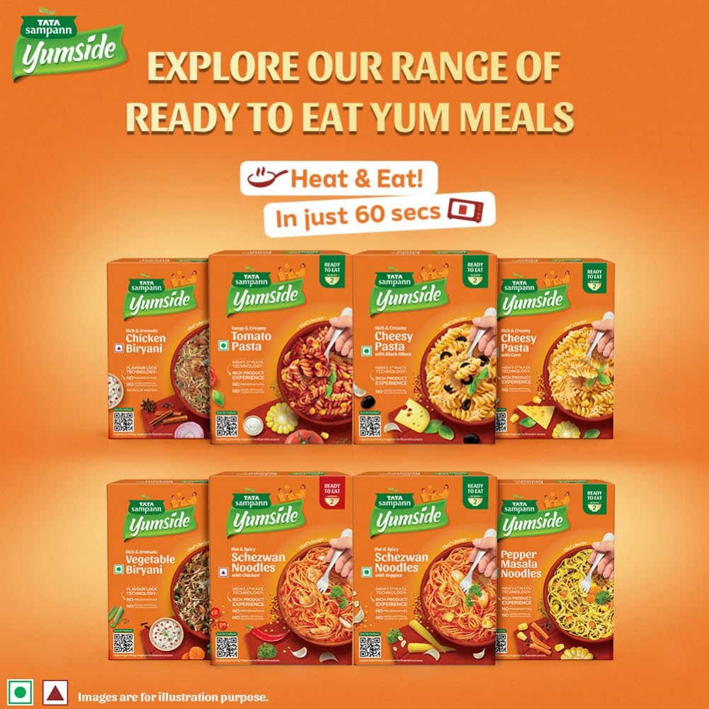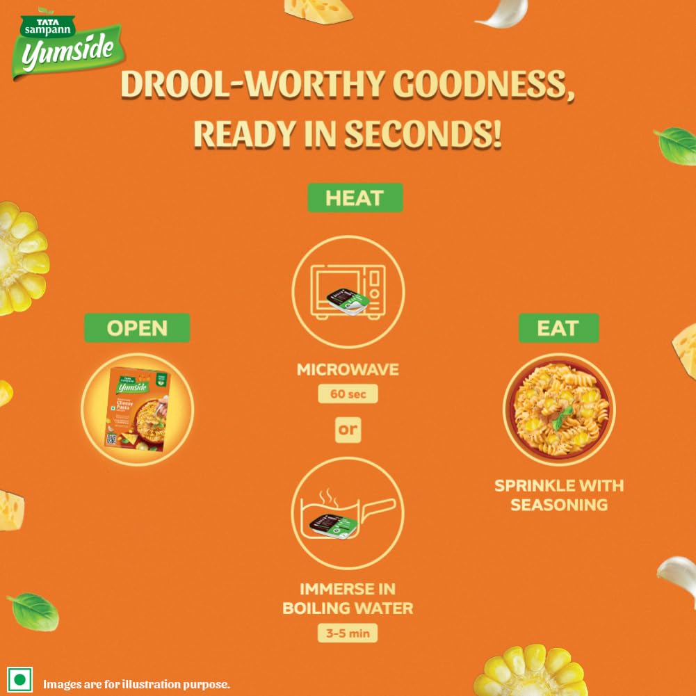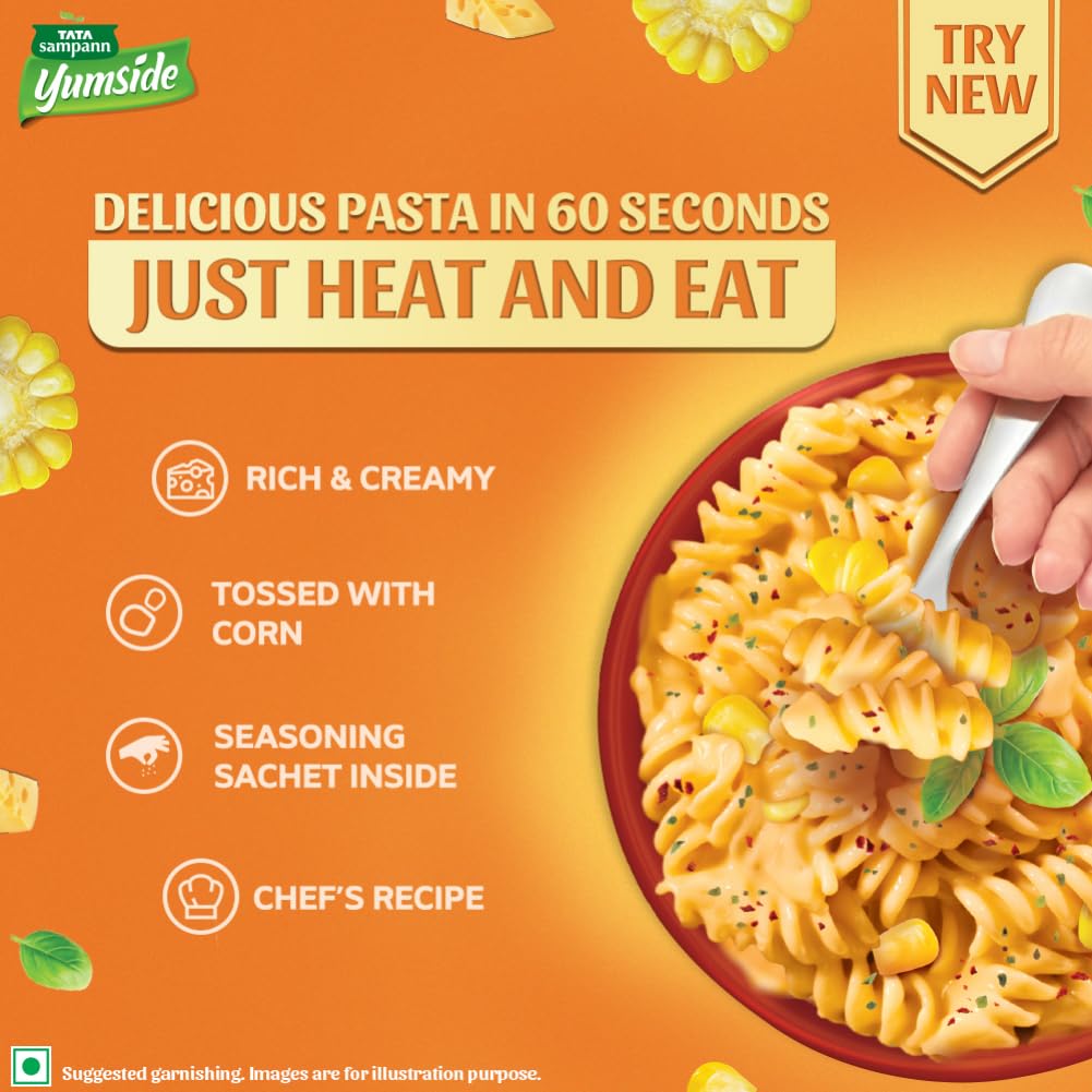 YUM MEAL WITH GOODNESS - An instant solution to your cravings! Looking for an instant and convenient way to kill those hunger pangs? Your search ends with Tata Sampann Yumside ready to eat meals which are made from high-quality ingredients and curated by professional chefs. Loaded with Corn and tossed in cheese sauce this rich and creamy instant pasta will satisfy your pasta cravings anytime! For times when you or your family crave something delicious for lazy days for treat days for days when you're running out of time for days when you just want to have more time for life! - This ready-to-eat meal comes to the rescue. All you have to do is heat the pack in the microwave for 60 seconds or immerse the tray in hot water for 3-5 mins and your instant meal is ready! Doesn't it sound great? Sprinkle the seasoning from the sachet mix well and enjoy! Enjoy a rich experience Tata Sampann Yumside ready-to-eat instant pasta is sealed with care using India's first Microwave Assisted Thermal Sterilization (M.A.T.S) Technology to offer you a rich product experience. For a delicious twist sprinkle the mixed herb seasoning provided with the pack. Storage Instructions: Store in a cool and dry place. It does not require refrigeration. Consume immediately once the pack is opened. Do not consume if the inner pack is puffed bloated or leaked.