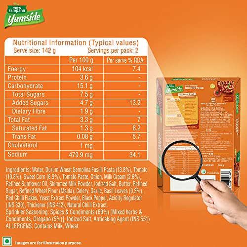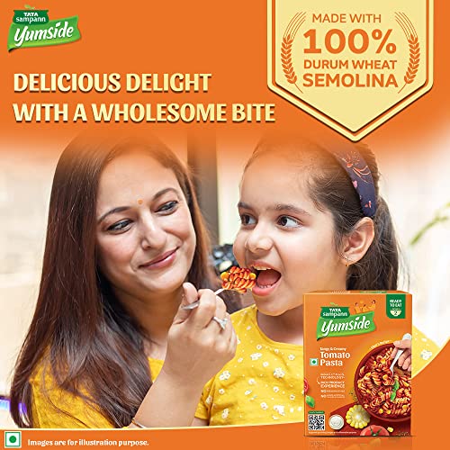 YUM MEAL WITH GOODNESS - An instant solution to your cravings! Looking for an instant and convenient way to kill those hunger pangs? Your search ends with Tata Sampann Yumside ready to eat meals which are made from high quality ingredients and curated by professional chefs. Loaded with Corn and tossed in a luscious tomato sauce this tangy and creamy instant pasta will satisfy your pasta cravings anytime! For times when you or your family crave something delicious for lazy days for treat days for days when you're running out of time for days when you just want to have more time for life! - This ready-to-eat meal comes to the rescue. All you have to do is heat the pack in the microwave for 60 seconds or immerse the tray in hot water for 3-5 mins and your instant meal is ready! Doesn't it sound great? Sprinkle the seasoning from the sachet mix well and enjoy! Enjoy a rich experience Tata Sampann Yumside ready-to-eat instant pasta is sealed with care using India's first Microwave Assisted Thermal Sterilization (M.A.T.S) Technology to offer you a rich product experience. For a delicious twist sprinkle the mixed herb seasoning provided with the pack. Storage Instructions: Store in a cool and dry place. It does not require refrigeration. Consume immediately once the pack is opened. Do not consume if the inner pack is puffed bloated or leaked.