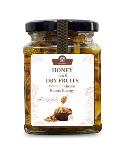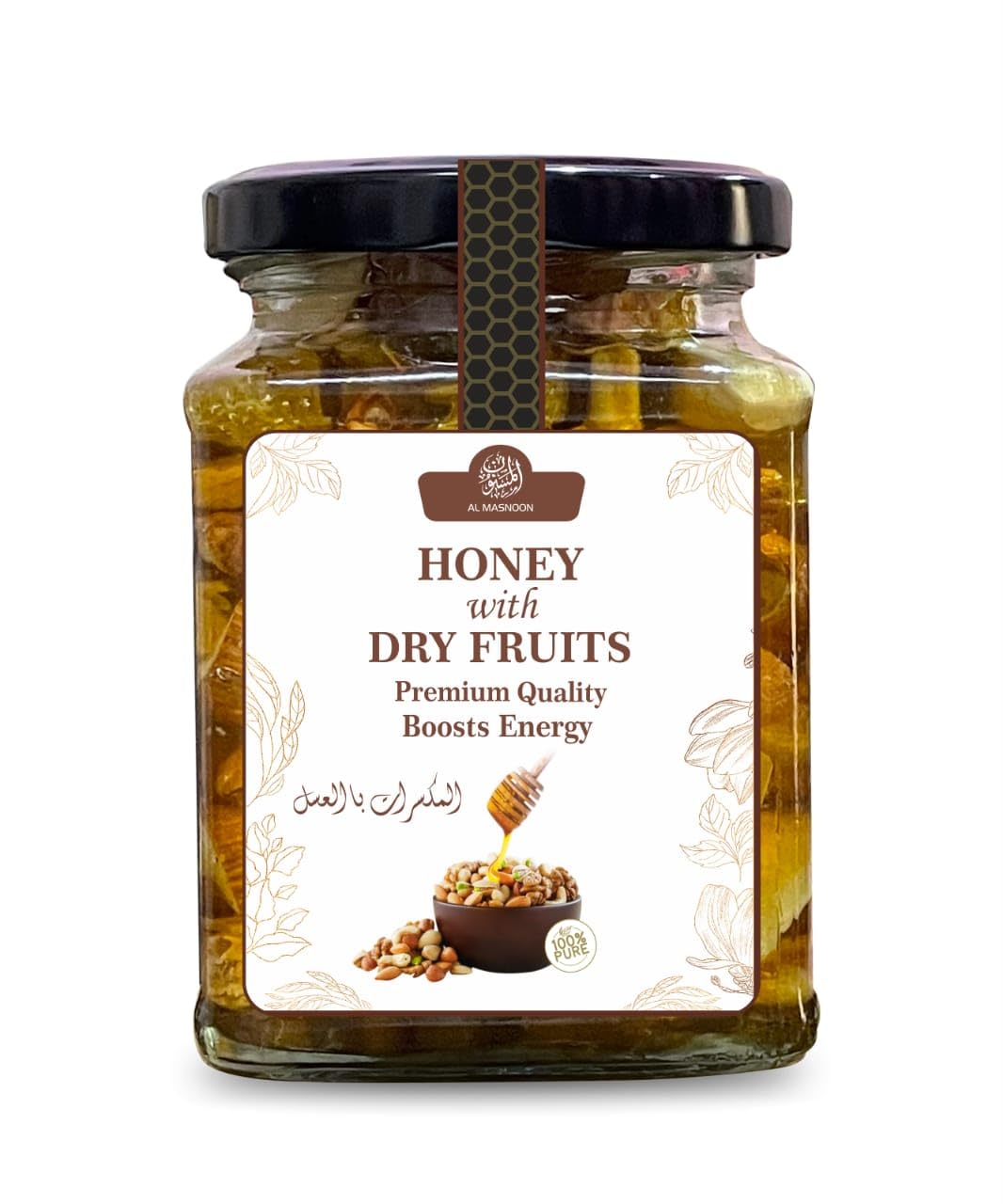 Al Masnoon Honey with Dry Fruits / Mixed Dry Fruits with Pure Honey & Saffron 300g" offers a luxurious blend of natural honey infused with nutrient-rich dry fruits and saffron. This premium-quality product combines the sweetness of pure honey with the richness of assorted dry fruits and the delicate flavor of saffron creating a delightful taste experience. Ideal for enhancing beverages spreading on toast or as a nutritious addition to recipes. Perfect for those seeking a flavorful and health-conscious sweetener option.