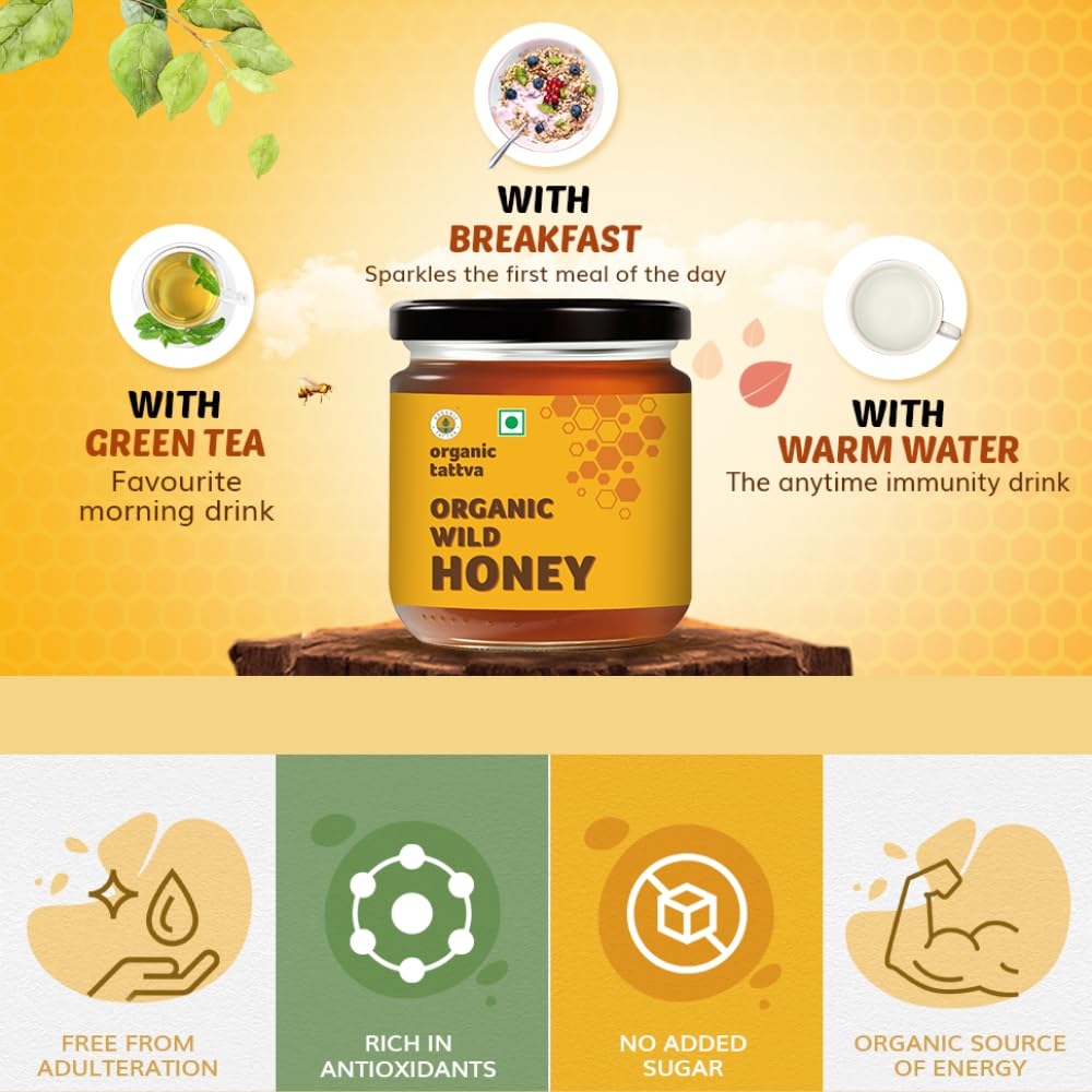 Organic Tattva's Organic Wild Honey is in its crudest form and is a source of calcium iron and protein. Along with these Organic Honey also rich in potassium and various other nutrients that your body needs. One serving of Organic Honey contains 0g trans-fat and 0mg cholesterol. The calorie count per serving of Organic Honey is 46.2. Switch to Organic Honey by Organic Tattva for a healthy lifestyle. Raw honey has been used for at least 10000 years playing a vital role in health religious and cultural traditions. Organic Raw honey is essentially the same as the honey found in a beehive except it's been treated to a filtration process that includes straining the honey through a mesh or nylon cloth to eliminate impurities like dead bees and beeswax. Aside from the filtration Organic tattva's raw honey is honey in its pure unheated unpasteurized and unprocessed form. This is perhaps one of the most important characteristics and health benefits of the final product as it preserves all the natural vitamins essential minerals enzymes phytonutrients and other nutritional elements. It is always best to source out raw organic honey and the only guarantee you're getting a truly organic product is to look for the USDA Organic certification badge on the label. Raw organic honey does not contain any pesticide antibiotics or environmental pollutants. Depending on source it is normal for raw honey to contain particles of bee pollen honeycomb bits and propolis. These inclusions contribute to the popularity of raw honey because they can be beneficial to overall health.