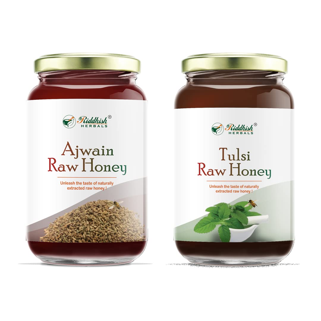 Riddhish HERBALS Organic Pure Ajwain & Tulsi Raw Honey Combo Pack | 100% Natural and Organic Honey | Unprocessed Unfiltered Unpasteurized Raw Honey | 500gm.