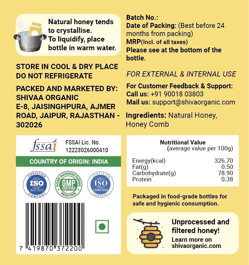 A fresh raw comb is the jewel of the hive which is pure and 100% natural. The comb is harvested from the bee hive and directly bottled. It has an experience of great taste and nutrition. It is majorly comprised of fresh raw honey and beeswax. It is unfiltered and unprocessed. Rich in nutrients and bursting with sweetness our 100% Raw SHIVA ORGANIC Honeycomb chunk in Organic honey is the perfect indulgent addition to your pantry and health regimes. When eating comb it's easy to appreciate and savour the true essence of honey as well as marvel at nature's ability to create such a perfect food. The slight waxy residue left after eating the comb is completely natural and can be chewed like gum while the sweetness lingers. 100% raw comb honey Natural Source of Vitamins and Dietary Fibre Organic and GMO-Free Natural Medicinal Properties Unfiltered and Unprocessed All Natural Native Honey from pesticide free zones No Additives or Preservatives Sustainably Harvested Hand Cut straight from the naturally made combs Great for Health and Wellbeing