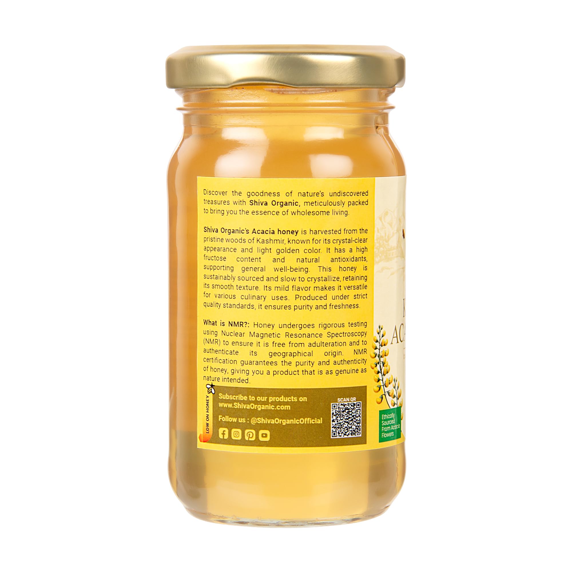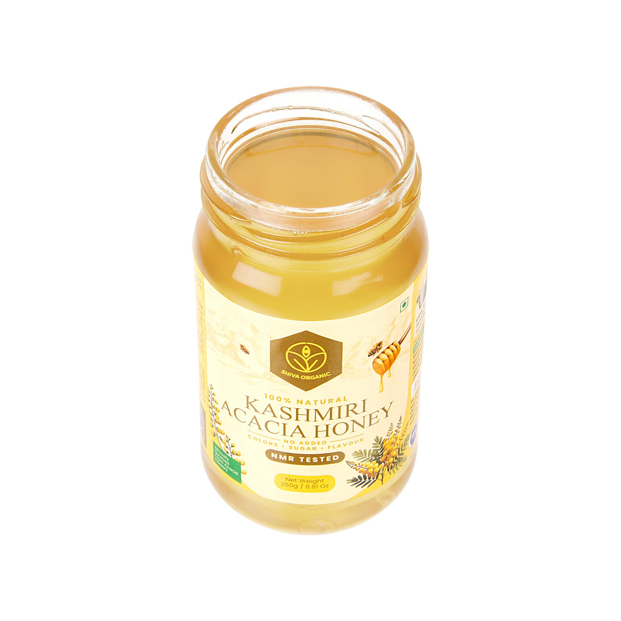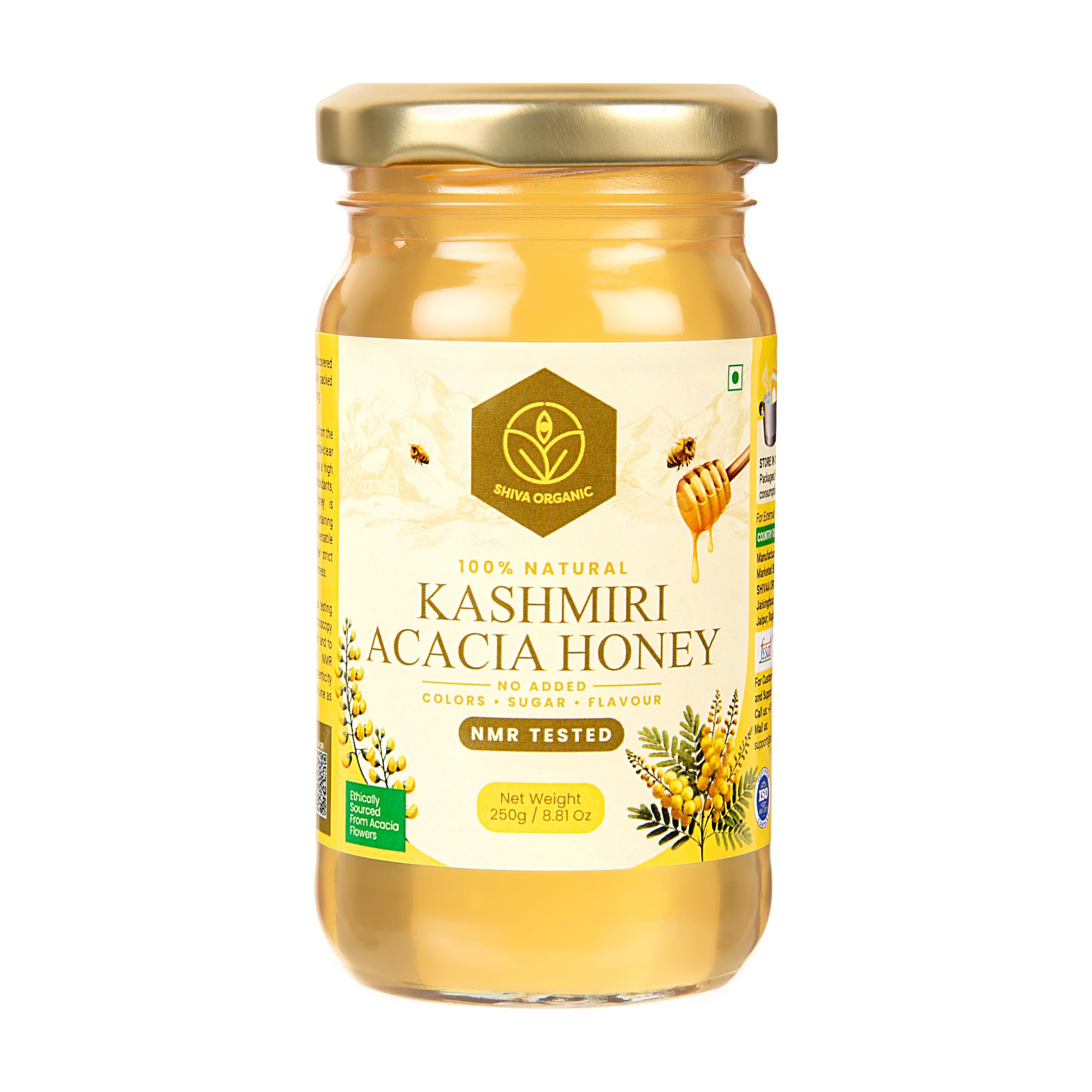Shiva Organic Acacia honey is produced in the uncontaminated woods of kashmir where the plant grows luxuriantly and in the month of May it is covered with fragrant white flowers from which a precious nectar flows that bees collect and transform into excellent honey. Transparent Kashmir honey is a natural miracle known for its crystal-clear appearance and delicious taste. This honey shines because of its light golden color and subtle floral aroma. Its purity and clarity reflect the pristine beauty of its origin with a sweet mild flavour. Transparent Kashmir honey is not only a joy for the mouth but it also has a wealth of health advantages making it an ideal combination of nature's best offers. It is characterized by very delicate olfactory hints of sugared almonds and vanilla. Its taste is very sweet with a fresh sweet almond aftertaste. Acacia is by far the richest in fructose and the sweetest of honeys. Acacia honey has a very low sucrose content and a high fructose level so it tends to be the primary choice for diabetics. Kashmir Acacia honey often regarded as one of the finest varieties of honey boasts several special qualities: