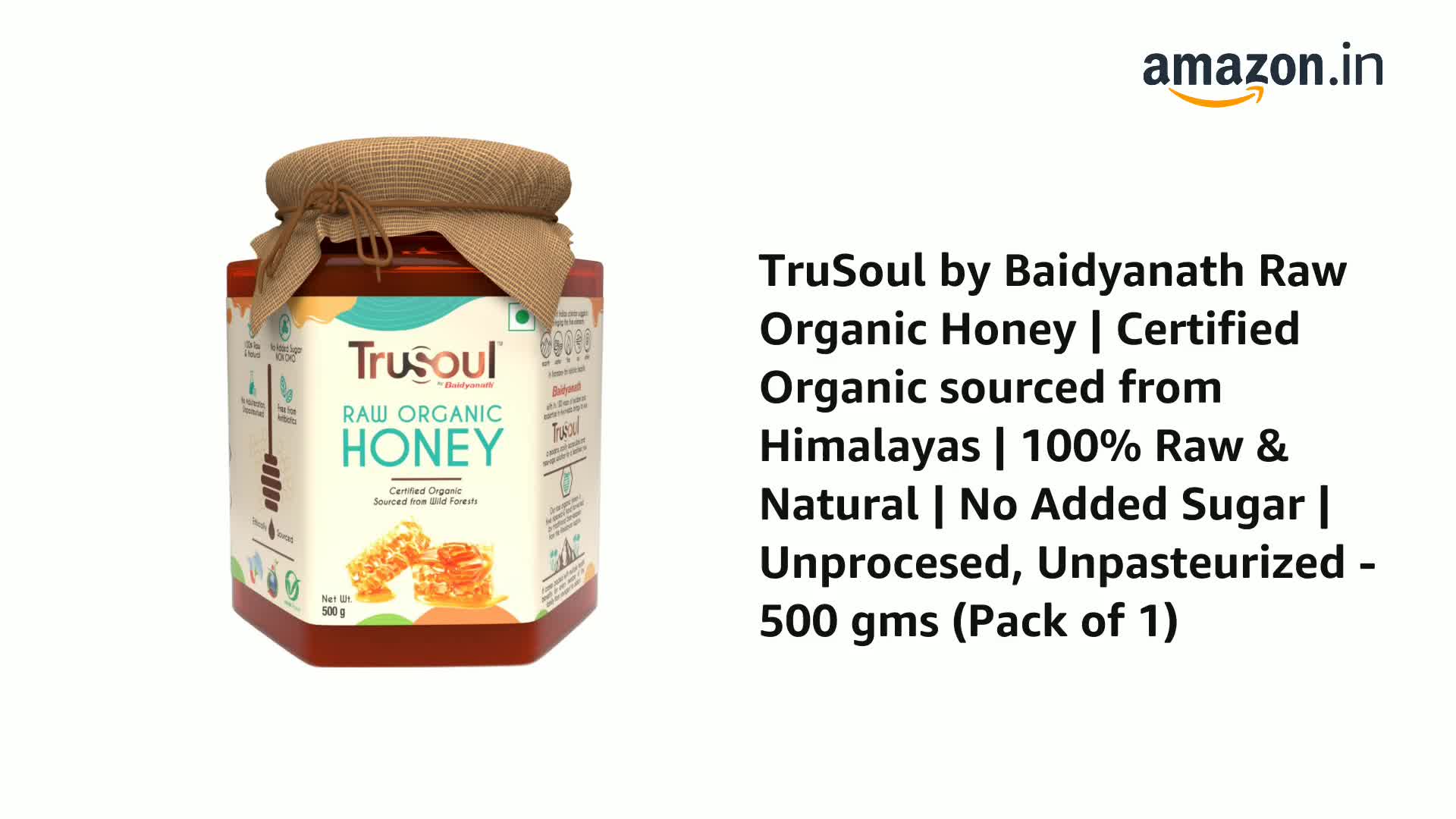 HomeGroceryFlavorsRaw HoneyTruSoul by Baidyanath Raw Organic Honey - 500 gm | Sourced from Himalayas | 100% Raw & Natural | No Added Sugar | No Antibiotics | Non GMO | Unpasteurized (Pack of 2)