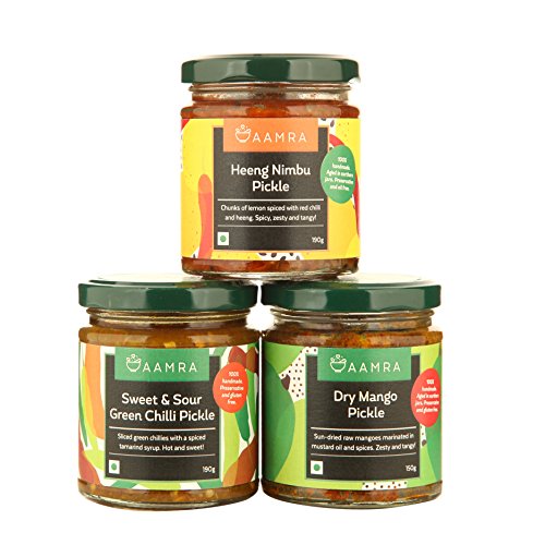 A delicious and dependable trio of home-style pickles. Aamra's pickles follow traditional recipes and time-honored techniques. Preserved naturally in special spice blends our pickles are aged in barnis (earthen jars) that are stored in cool dark rooms to draw out the natural flavors. Pickles that will add a punch to every meal Aamra's pickles are easy to store and convenient to use. Serve this delicious pickle with Indian meals curd rice and parathas for the perfect breakfast! Aamra's products are 100% handmade by the women of Nari Shiksha Kendra. No artificial preservatives Gluten Free Oil free. Preserved traditionally in earthen jars or 'barnis'.