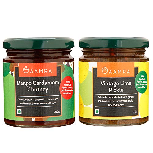 Get this authentic and traditional pickle and chutney combo from the house of Aamra. Vintage lime and mango cardamom is a taste and traditional handmade sweet and spicy ready to eat pickle and chutney. Pickle and chutney will add extra punch in your every meal. You can take this dry mango and cardamom chutney with you anywhere as it comes in jar which is easy to carry while travelling in hostels also it can be easily store in dark cool room. Aamra's products are 100% handmade by the women of Nari Shiksha Kendra. No artificial preservatives Gluten Free. Preserved traditionally in earthen jars or 'barnis".