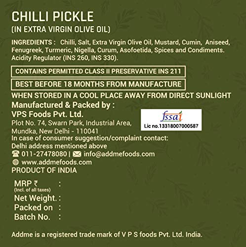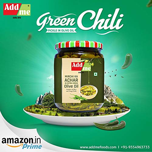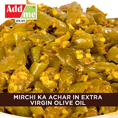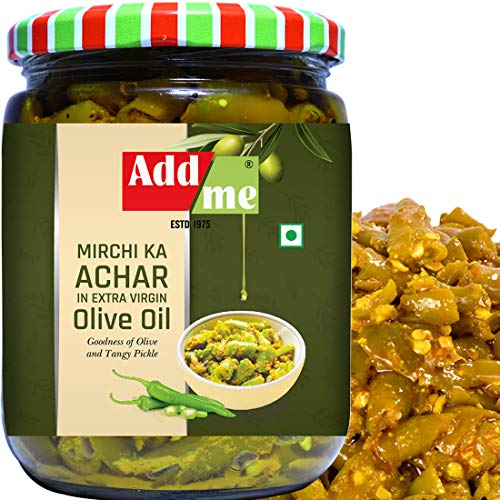 Add me Chilli Pickle in Olive Oil 500gm, Hari mirch ka Achar in Olive Oil Glass pack. Green Pickle in pure Extra Virgin Olive Oil is the ultimate Chilli Pickle you will ever Have. Mild flavour & taste A Quality Product Simply Home made flavor & taste. Definitely Vegetarian! No Artificial colors. No additives.