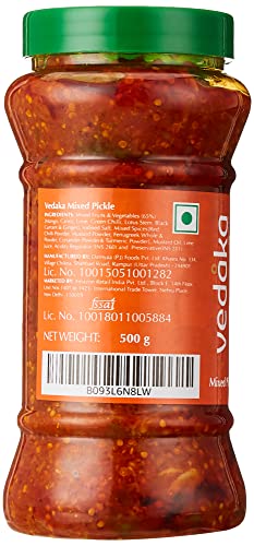 Introducing Vedaka Mixed Vegetable Pickle. Made with high quality fresh vegetables this traditional home-style pickle packs in a mouth-watering combination of spicy and tangy flavors. The ideal balance of skillfully curated spices aromatic oil and garden-fresh vegetables adds a lip-smacking punch to your daily meals. The mustard oil used to pickle the vegetables adds to the robust taste texture and aroma of the product. The Vedaka Mixed Vegetables pickle is a flavorsome condiment that enhances the taste of idli dosa samosa paratha khichdi khakra etc. and adds a tangy punch to almost every Indian dish out there. Relish the taste of crunchy carrots spicy chillis delectable tomatoes and more with this mixed vegetable pickle that tastes like home- made pickle. The product is hygienically packed in PET jars to keep the freshness and flaD4vor intact. The packaging is certified by HACCP (a GFSI recognized certification programme).