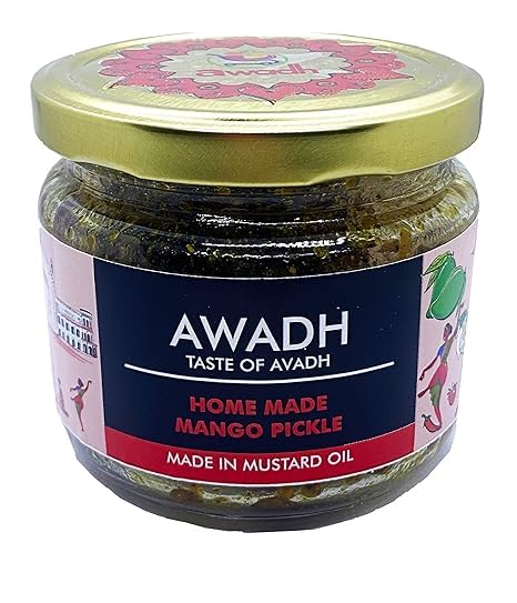 AWADH- Mango Pickle 250g |U.P-Style Aam Ka Sukha Bharua Achar | LowOil & Low Salt | Tangy Spicy Sour and Salty | Dark Brown Mango Pickle | Long Sized Mango Pieces |Homemade Pickle |