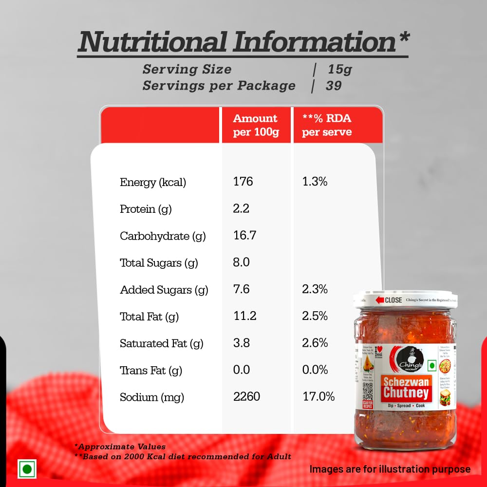 Ching's Secret Schezwan chutney adds a burst of flavour to your dishes and makes them sizzle with taste. You can use this chutney with almost anything and everything including paratha vada pav bhajiya pasta and more. Serve this spicy chutney as a dip with wafers fries papads bhajiya pakoda samosas spring rolls tikkas kebabs and nuggets. Spread it on dosas uttapams omelettes vada pav sandwiches and rolls to make them sizzle. Cook fried rice chowmein egg masala and paneer dishes with it to fire them up. Every bite will make you scream âI Love Desi Chinese!â