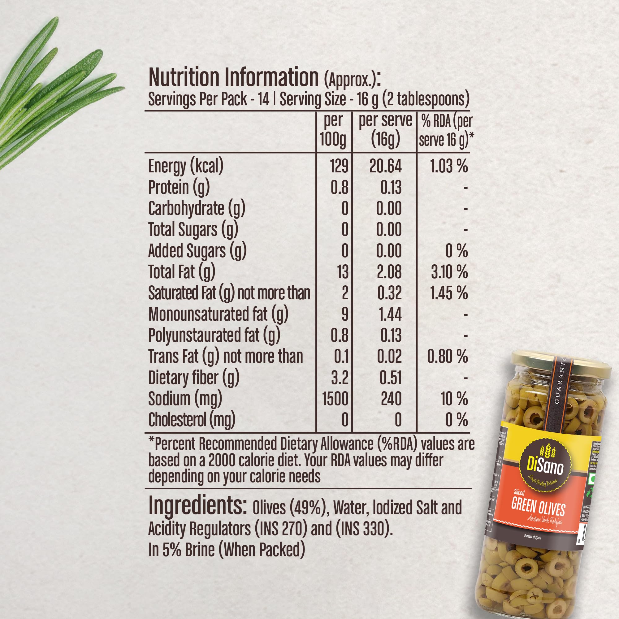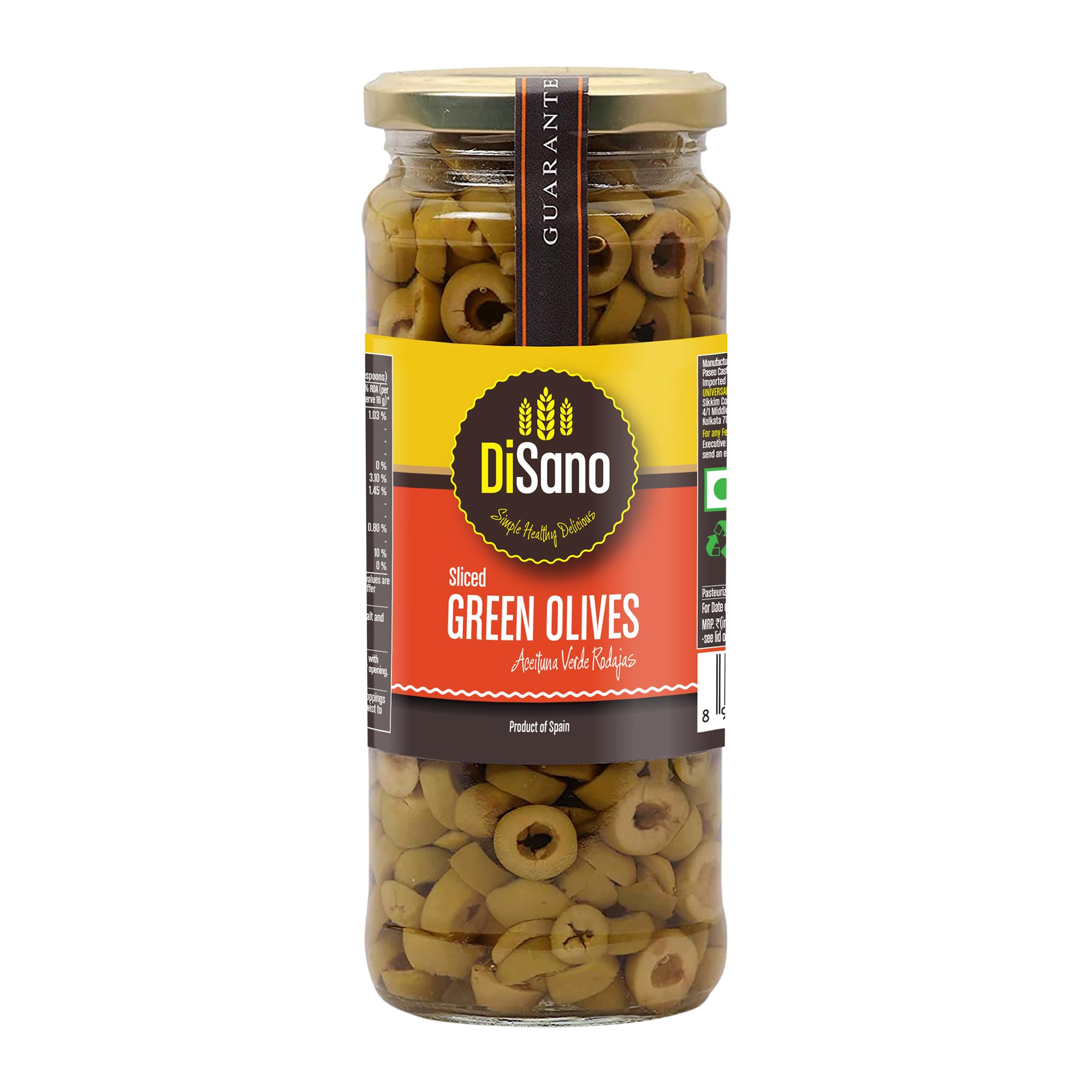 DiSano Sliced green olives are green olives that have been evenly cut olive slices. This preparation makes them easy to incorporate into various dishes adding flavor and texture.