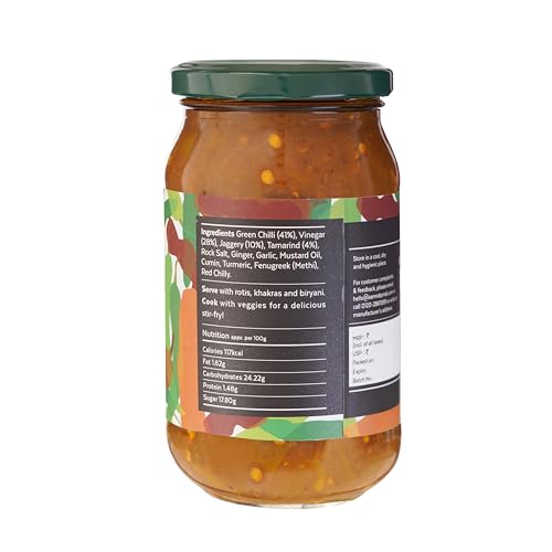 Hot & Sweet | Sliced green chillies in a spiced jaggery & tamarind syrup. Low Oil (Mustard Oil) Serve this tangy chilli Pickle with rotis mathis and pulaos or toss with veggies for a stir-fry - A great accompaniment for snacks!