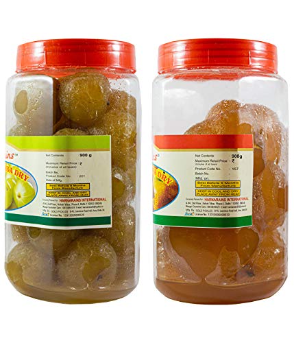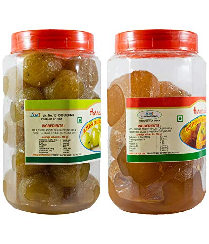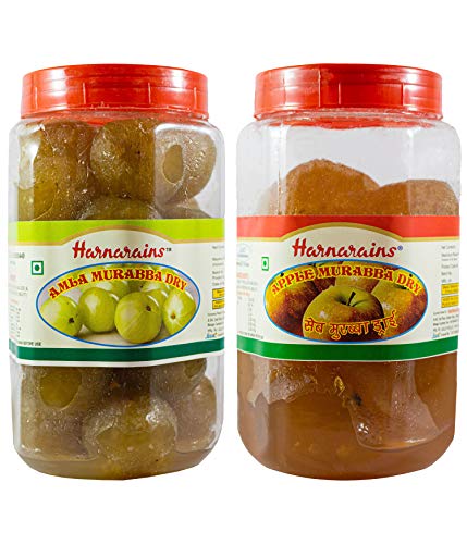 A combo pack of Amla Murabba Dry and Apple Murabba Dry which curates the health benefits of both of these! Both of these Murabbas are our best selling items and there's simply no way you can resist yourself from eating these all day long. Amla is a miracle fruit that holds the place of pride in Ayurveda. This neon-green colored fruit murabba packs numerous health benefits and contains Polyphenols Vitamin C Vitamin A Calcium Magnesium and Iron among others. Apples are well known for their rich iron content and are perfect for strengthening teeth and bones as well as keeping painful inflammations and arthritis away. Both of these Murabbas possess a delicious sweet taste and their perfectly sized pieces can be served to people of all ages - to children in their lunch boxes as well as to aged people in their breakfast. These syrup-less Murabbas are ready to eat right out of the box. This combo pack comes in a set of 2 durable plastic PET jars.