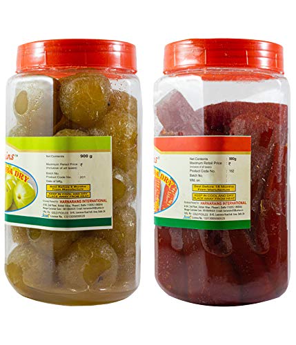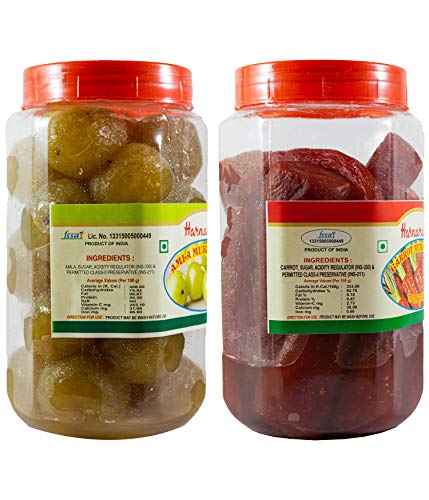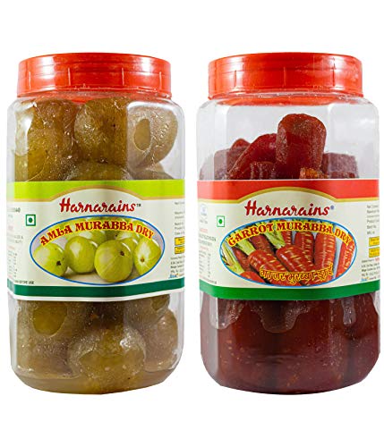 A combo pack of Amla Murabba Dry and Carrot Murabba Dry which curates the health benefits of both of these! Both of these Murabbas are our best selling items and there's simply no way you can resist yourself from eating these all day long. Amla is a miracle fruit that holds the place of pride in Ayurveda. This neon-green colored fruit murabba packs numerous health benefits and contains Polyphenols Vitamin C Vitamin A Calcium Magnesium and Iron among others. Rich in Vitamin A Carrot Murabbas are the best in treating eye diseases and vision problems. Being a good source of nutrients Carrot Murabbas are also beneficial for general debility weakness fatigue and mental stress. Both of these Murabbas possess a delicious sweet taste and their perfectly sized pieces can be served to people of all ages - to children in their lunch boxes as well as to aged people in their breakfast. These syrup-less Murabbas are ready to eat right out of the box. This combo pack comes in a set of 2 durable plastic PET jars.