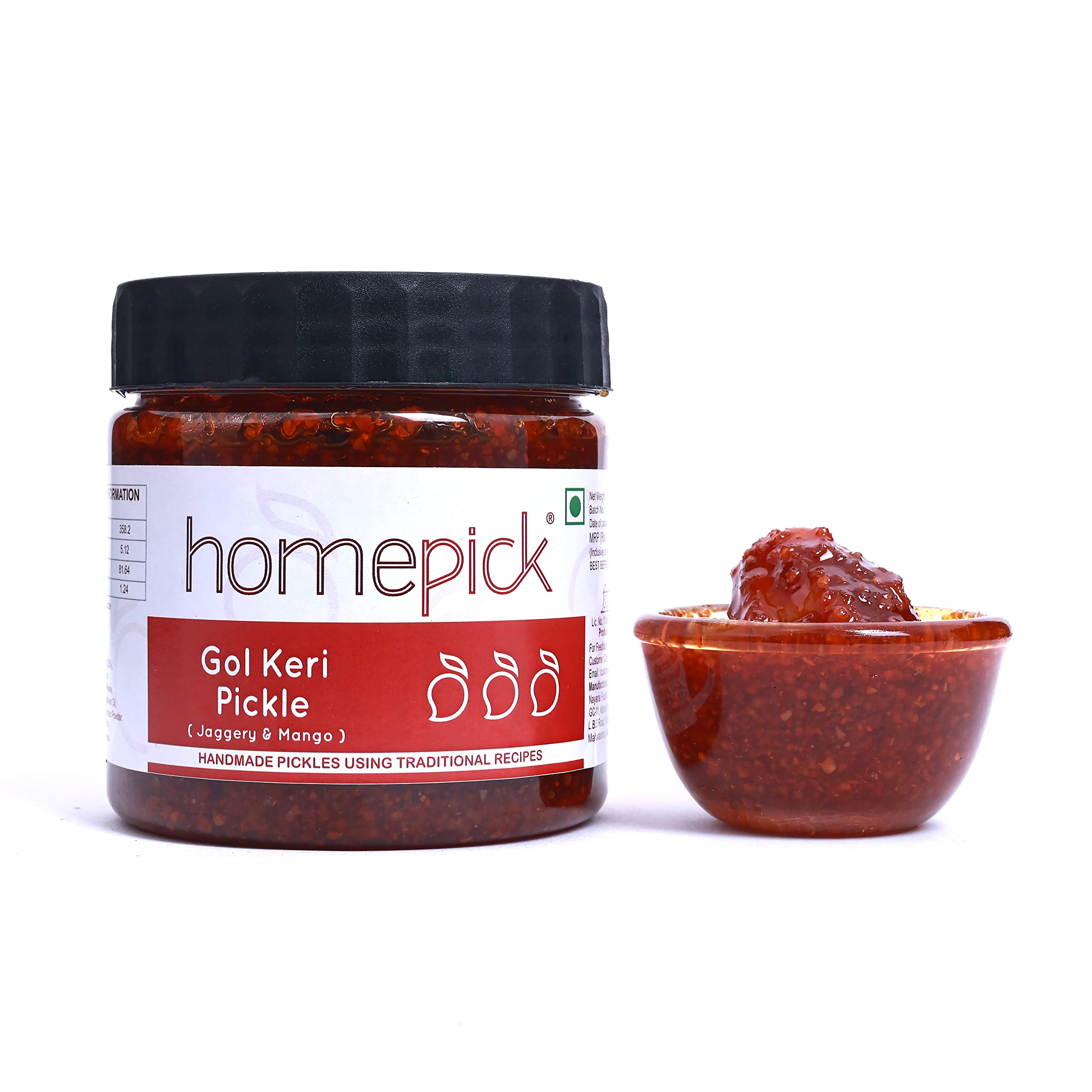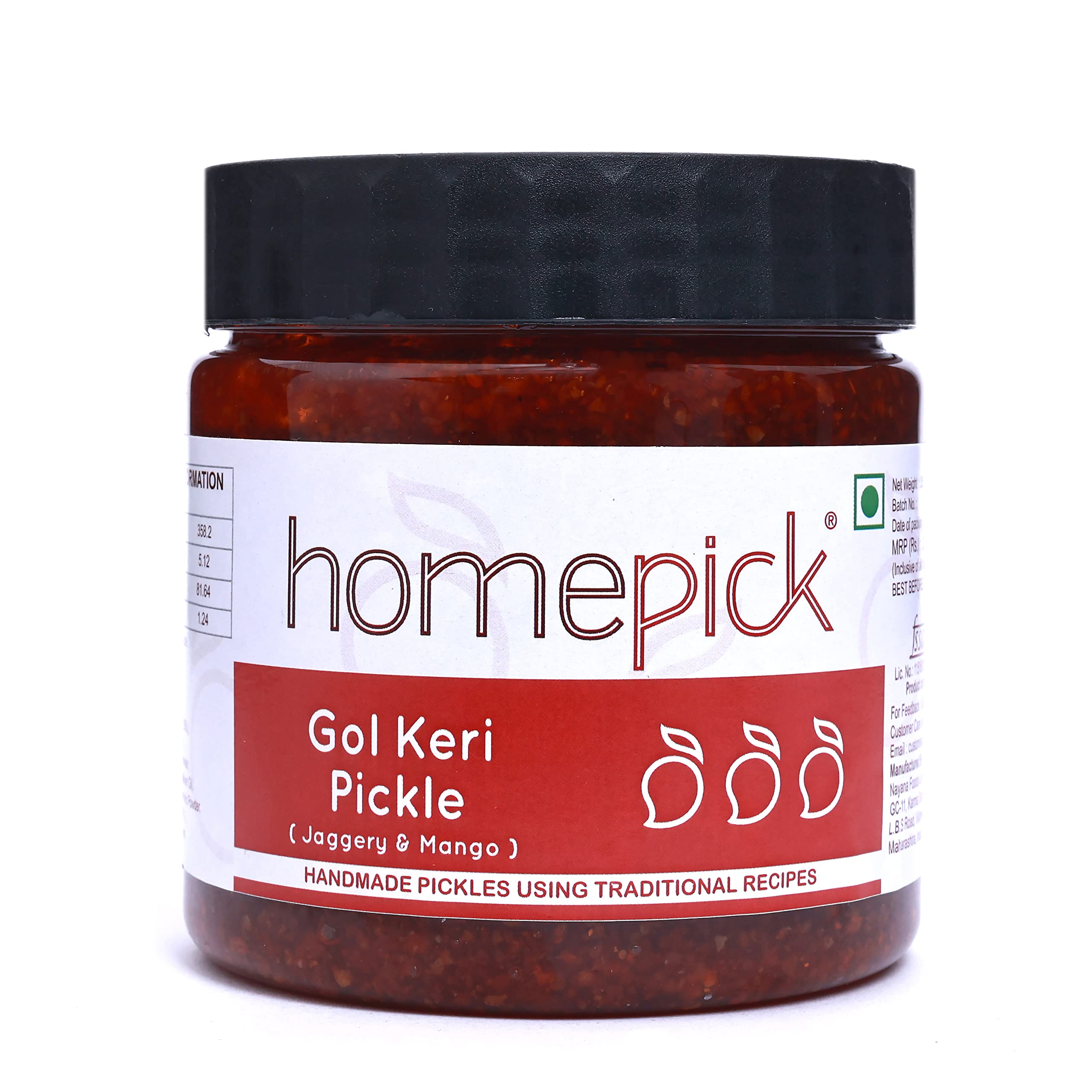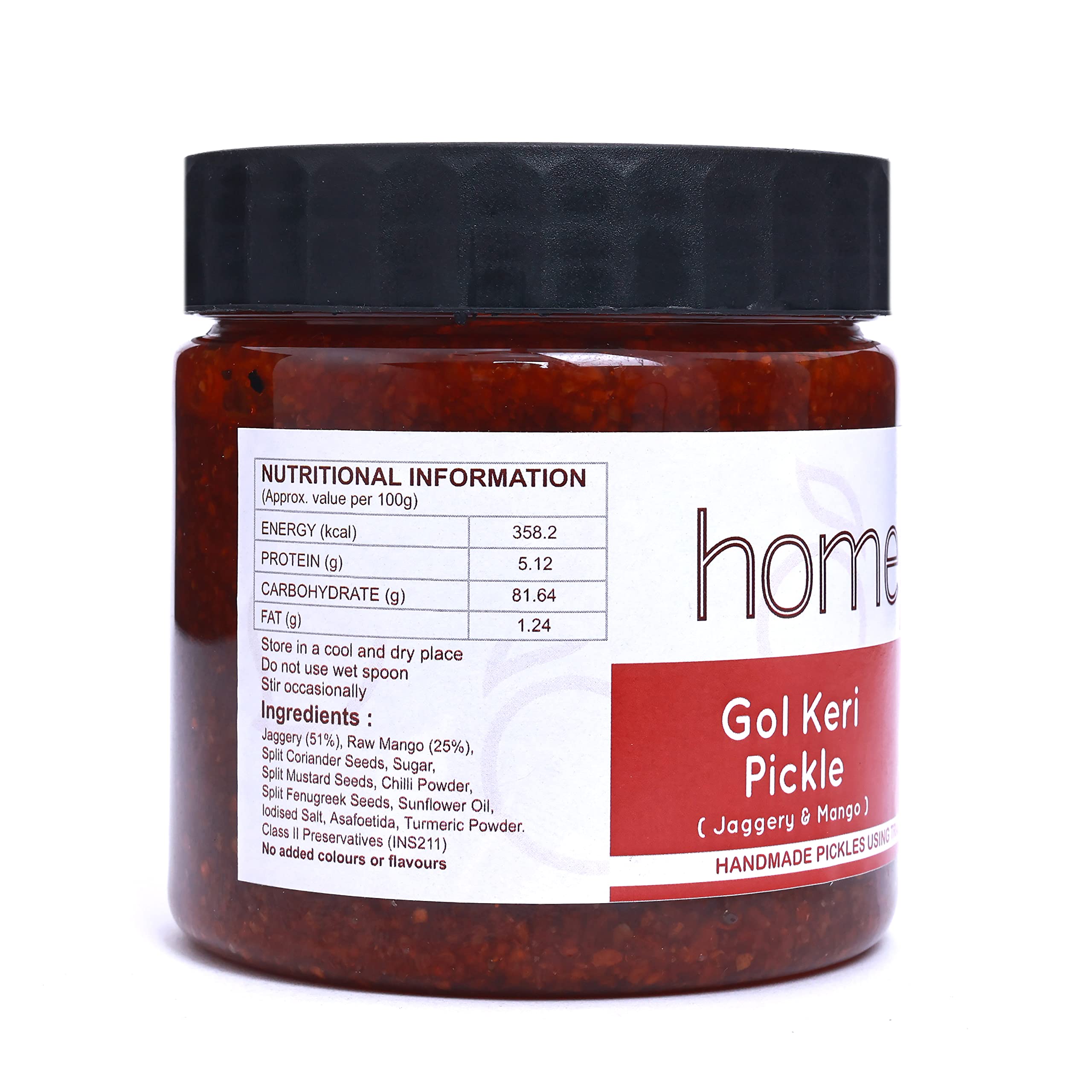 Sweet and medium spicy Gujarati style mango pickle. This pickle is a speciality from Gujarat and is made using premium quality Spices Jaggery and Raw Mangoes. All our pickles are handmade using the most pure and premium quality ingredients be it mangoes, lemons, chillis, oil or spices. We make over thirty different varieties of pickles which range from the conventional to the most unique varieties of pickles consisting of sweet to sour to spicy to tangy recipes catering to each and every palate. Our variants include several regional specialties of India like the Gujarati Chhundo and Gol Keri, Rajasthani Ker Sangri, Andhras Avakkai Mango, Maharashtrian Thecha, Kolkatta Pickle and many others.