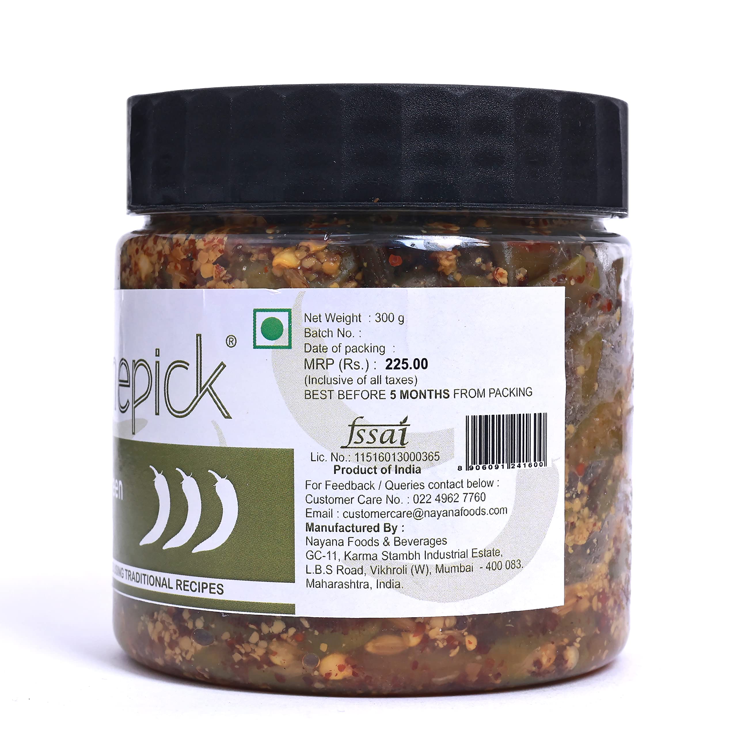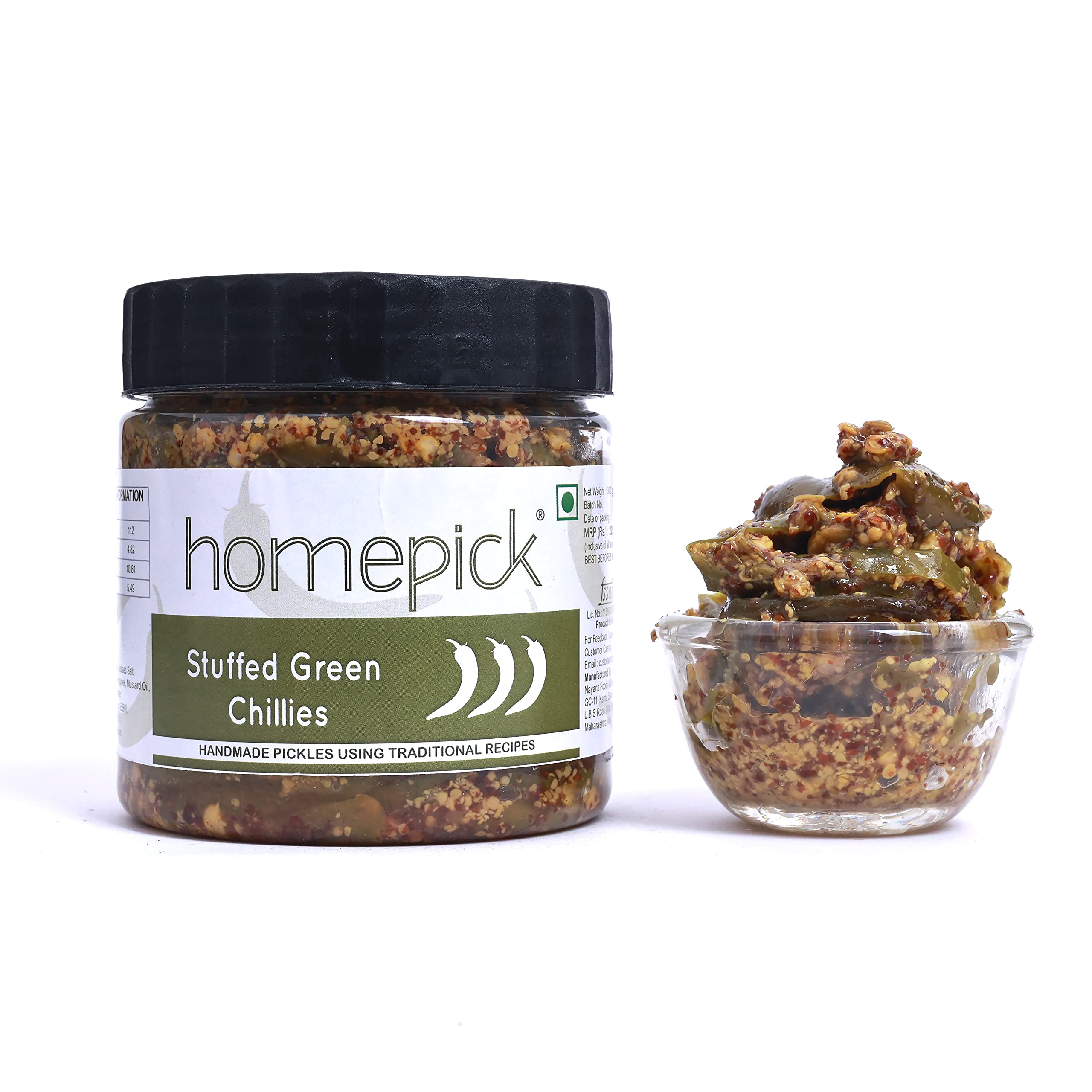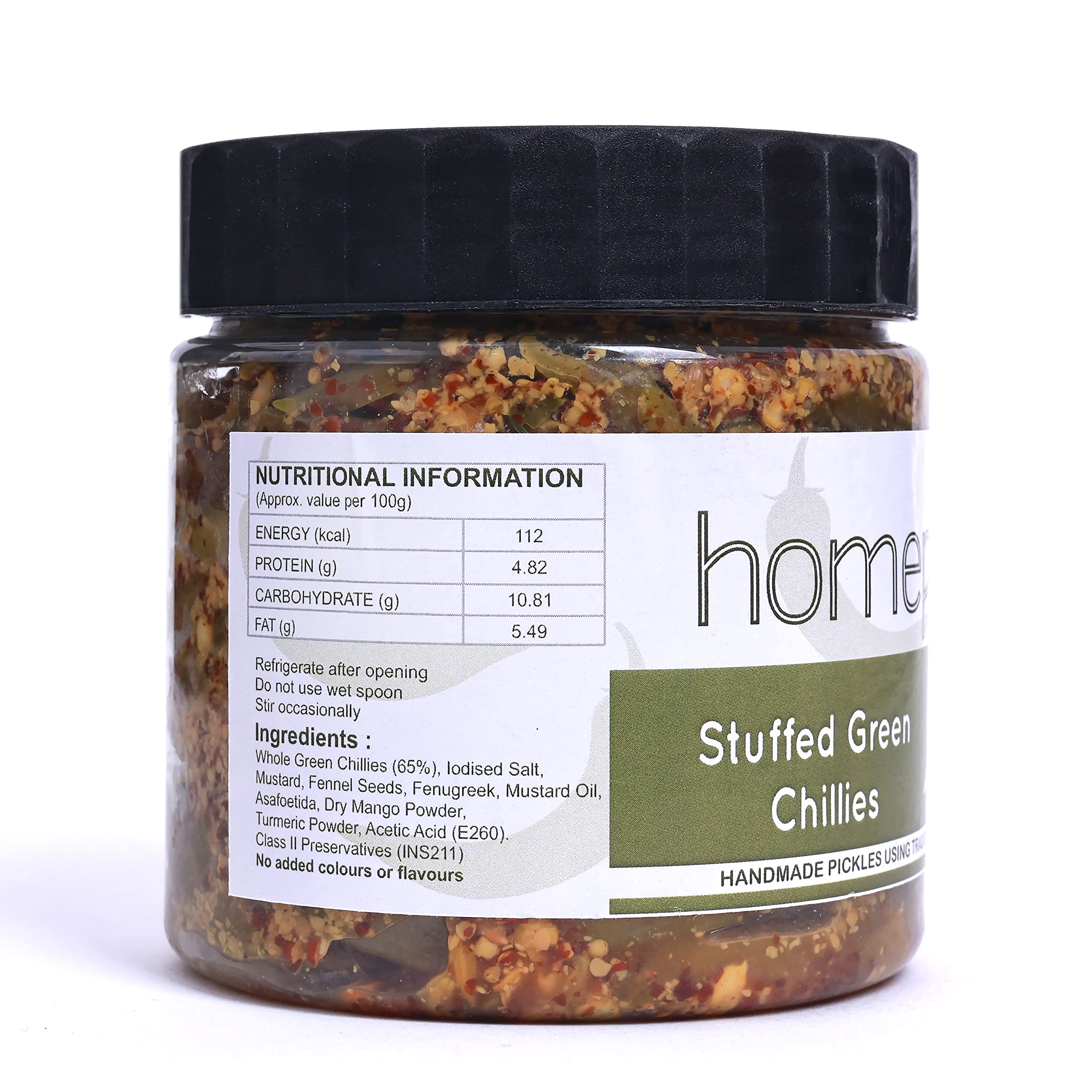 This pickle is made using whole long green chillis sourced from Rajasthan. They are absolutely non spicy in nature but our recipe makes them extremely flavourful as they are stuffed with traditional Indian spices like mustard fenugreek dry mango powder salt and very little oil. All our pickles are handmade using the most pure and premium quality ingredients be it mangoes, lemons, chillis, oil or spices. We make over thirty different varieties of pickles which range from the conventional to the most unique varieties of pickles consisting of sweet to sour to spicy to tangy recipes catering to each and every palate. Our variants include several regional specialties of India like the Gujarati Chhundo and Gol Keri, Rajasthani Ker Sangri, Andhras Avakkai Mango, Maharashtrian Thecha, Kolkatta Pickle and many others.