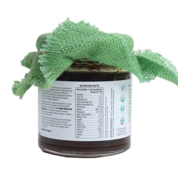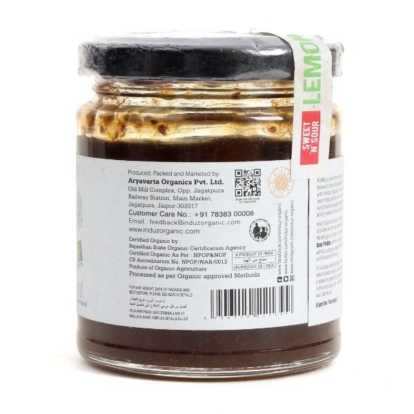 Induz Organic Lemon Pickle - 200 GM is prepared from best quality Natural & Fresh Lemons. This Natural Pickle does not contain any artificial color or flavor to make it tasty. Only Natural & Fresh Spices are used to prepare Induz Organic Lemon Pickle - 200 GMS. So all the natural nutrients are intact in the pickle.INDUZ ORGANIC's mission is to help people live a healthier, wholesome life by providing them with a variety of 100% certified, authentic organic foods. We value honesty, integrity and continual self-improvement. We are committed to a sustainable environment, zero-itive foods and complete customer-satisfaction. The brand INDUZ ORGANIC is based on the principles of health, ecology, fairness and care.