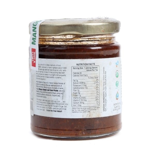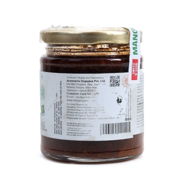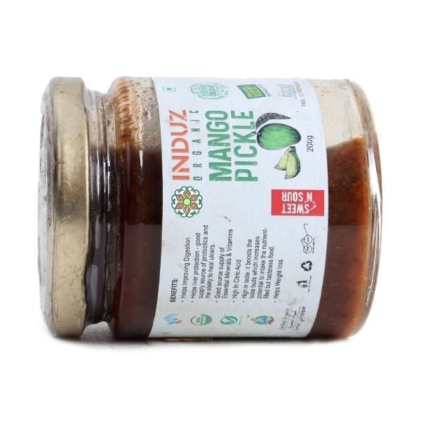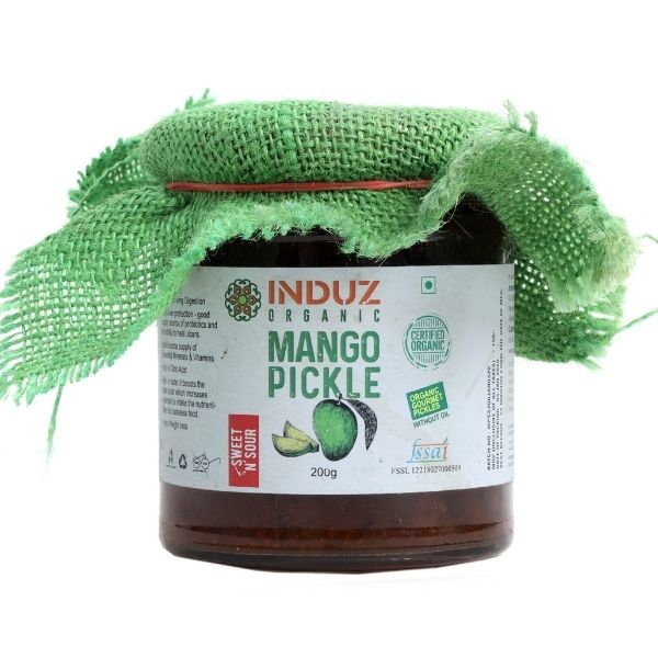 Induz Organic Mango Pickle - 200 GM is prepared from best quality Natural & Fresh Mango. This Natural Pickle does not contain any artificial color or flavor to make it tasty. Only Natural & Fresh Spices are used to prepare Induz Organic Mango Pickle - 200 GMS. So all the natural nutrients are intact in the pickle.INDUZ ORGANIC's mission is to help people live a healthier, wholesome life by providing them with a variety of 100% certified, authentic organic foods. We value honesty, integrity and continual self-improvement. We are committed to a sustainable environment, zero-itive foods and complete customer-satisfaction. The brand INDUZ ORGANIC is based on the principles of health, ecology, fairness and care.