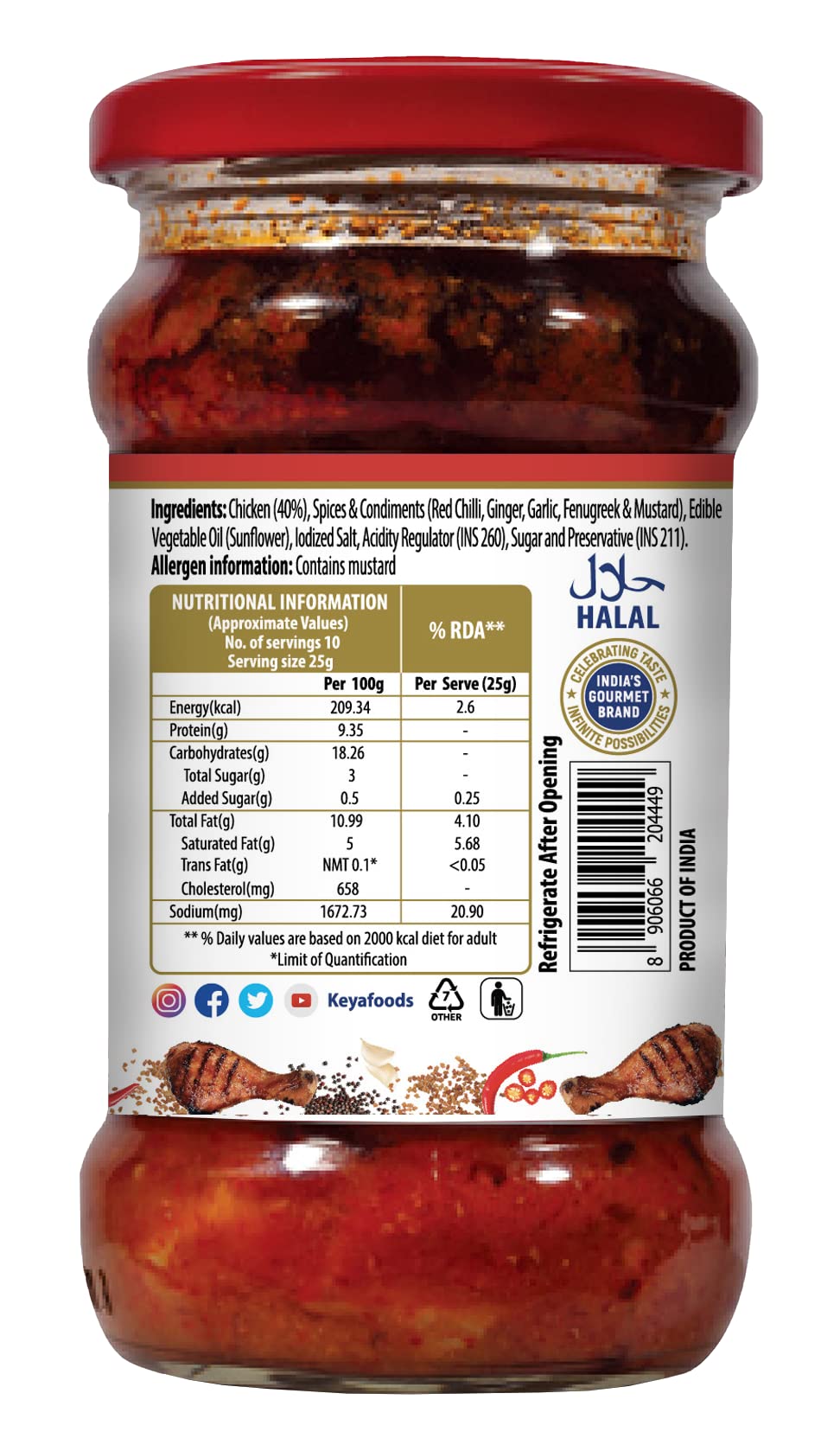 The flavour is good as well as the chicken pieces are soft and juicy, but the pickle is little too sour and also the oil content is too much. I won't recommend this product as the price is little bit expensive, you can buy 1 kilo of fresh chicken for 200 Rs but this pickle costs 200 Rs for only 270 g of pickle.