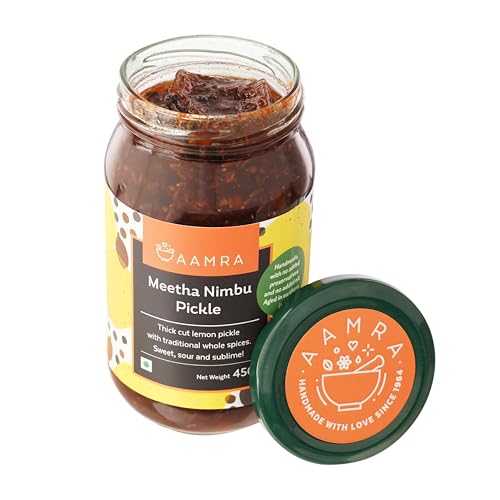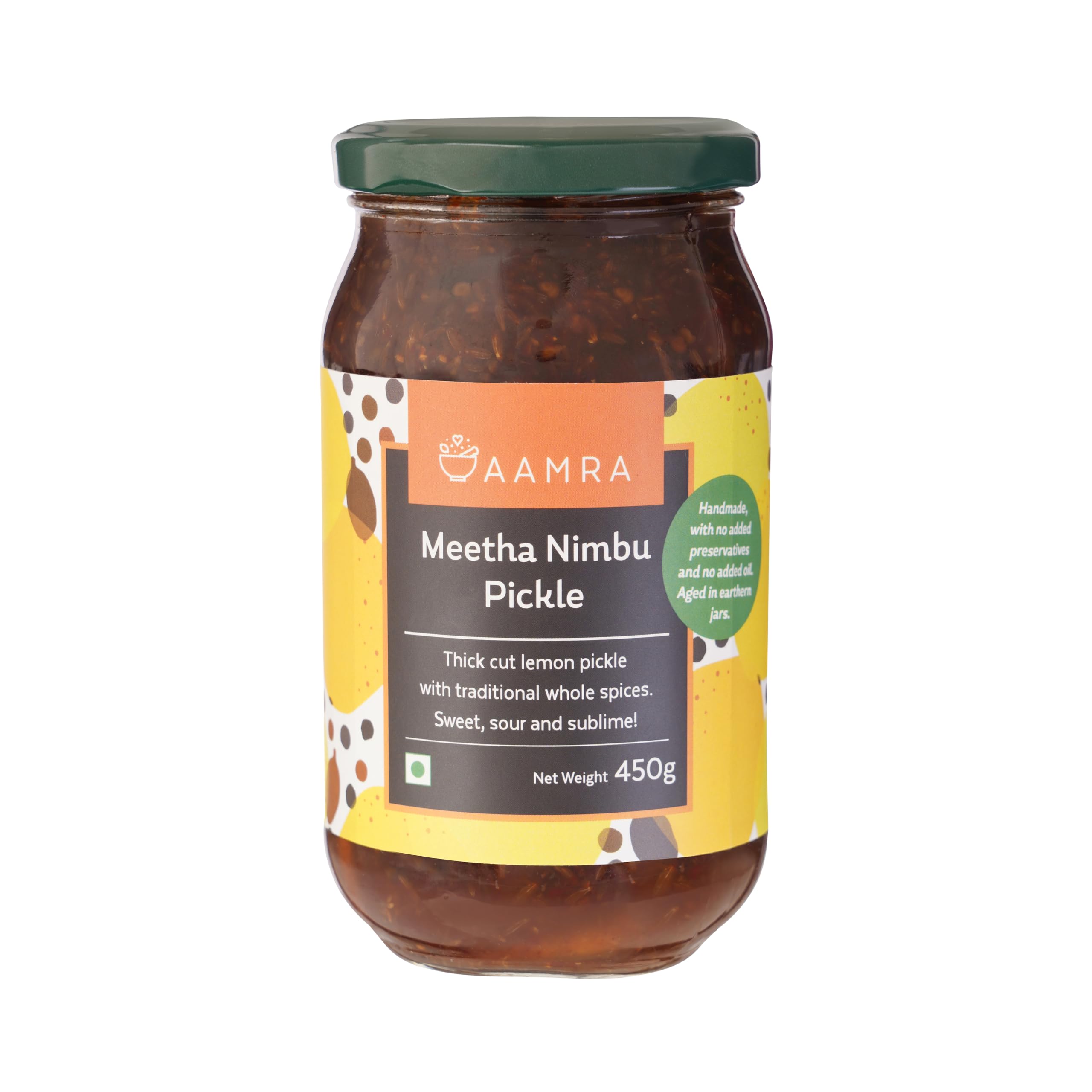 Sweet Sour & Mature | Thick cut lemon pickle with traditional whole spices. Aged for two years in earthen jars. Sweet and sour Meetha nimbu pickle tastes divine with daal-chaawal mathri and khakra or add to your daal for a lemony flavour.