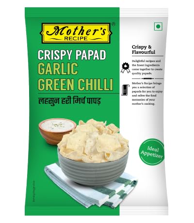 Mother's Recipe Crispy Garlic Green Chilli Papad. Lovingly prepared in grandma's traditional recipe this light crunchy snack makes for a delicious treat for the entire family