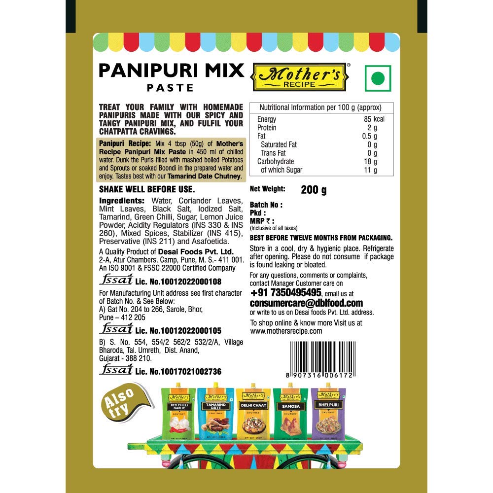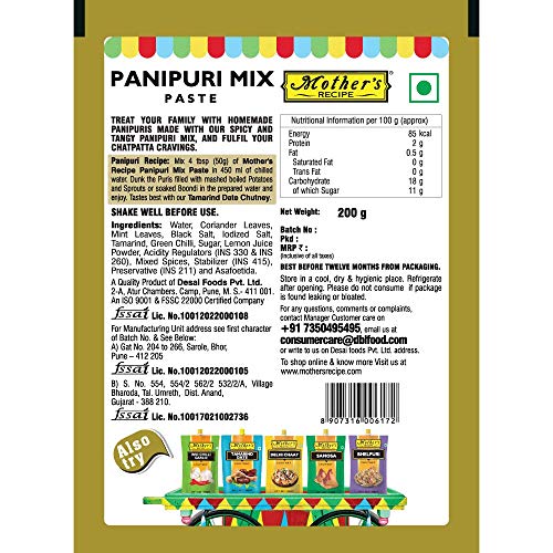 Make your home-made panipuri more delightful with the help of our tangy panipuri mix paste. Mix 4 table spoon (50g) of Mothers Recipe panipuri mix paste in 450ml of chilled water. Dunk the puris filled with mashed boiled potatoes and sprouts or boondi in the prepared water and enjoy. Tastes best with our tamarind date chutney.