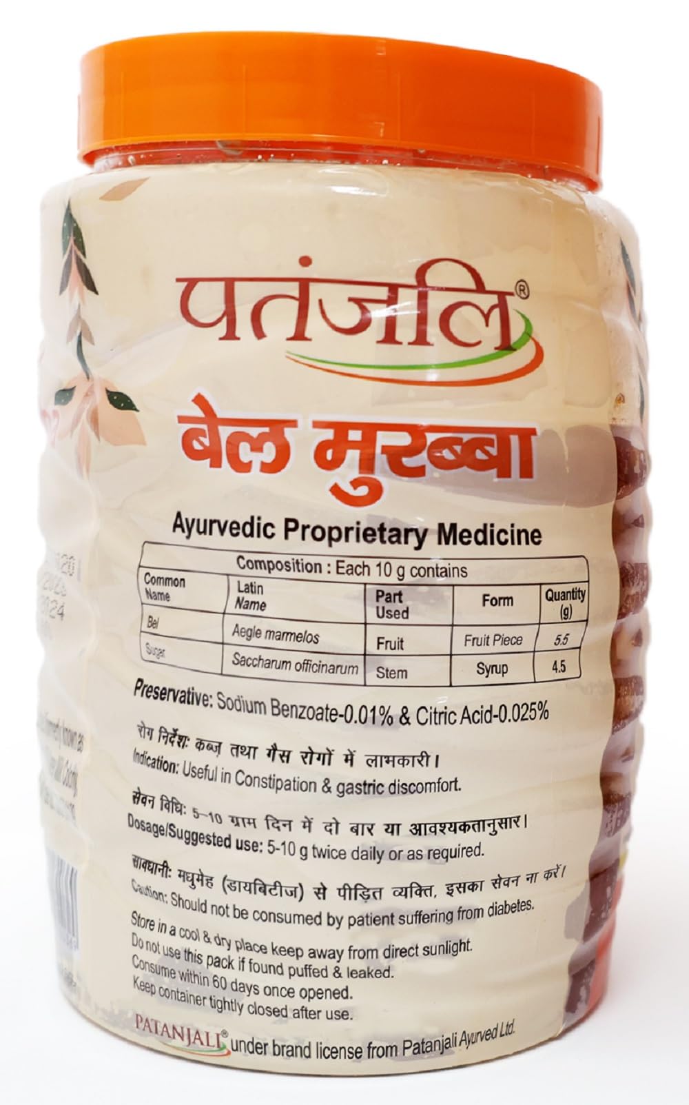 Patanjali Bel Murabba is made from high-quality fresh bel fruit which is known for its coolant effects. Bel fruit has great medicinal values. Bel has digestive and carminative properties which help to strengthen the digestive system and regulates bowel movement. It consists of carbohydrates fats protein vitamin C and minerals like iron phosphorus carotene and thiamin. Bel cleanses the liver and strengthens liver functions.
