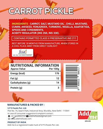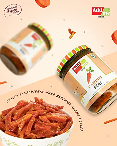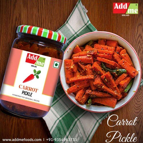Addme Carrot pickle is a mild tangy pickle made from fresh red carrots. It Is first washed and cut into small pieces, marinated in mustard seeds to give you that tangy flavor. its crispy and full of flavor.