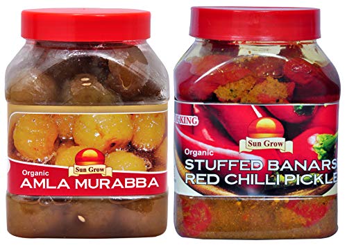 Sun Grow Food ( Combo Pack of 2) The Real Taste of Home Made Organic Amla Murabba with Jaggery (Guud Murabba) 1kg--&-- Homemade Stuffed Banarasi Red Chilli Pickle ||Traditional Banarasi Flavor, Tasty & Spicy || 1kg