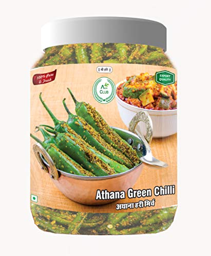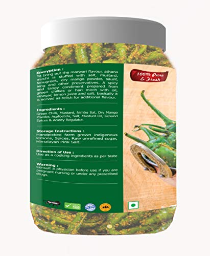 Authentic Rajasthani Athena mirchi pickle from the brand Agri Club. Agri Club is renowned for its wide range of marwari pickles Finest ingredients & traditional recipe used to ensureenuine texture and flavour Made from the special breed of chillies that are fleshy long and arerown in athana village Stuffed with salt mustard fenugreek dry mango powder saunf hing and other spices to ensure the true taste of Rajasthani pickles Agri Club: a symbol of quality & purity Total weight: 750rams Shelf Life: 365 days