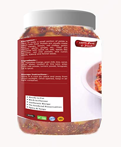 TREASURE HOUSE OF TASTE :ive your taste buds a treat by ordering our mouth-watering pickles like Carrot Delareen Chilli Mixed. AUTHENTIC DISTINCT AND HEALTHY: All the Essentials areraven organically with organic method which ensure quality and originality ofood. HOMEMADE: Made with traditional recipes handed down throughenerationsiving your buds the essence of Mother love. COMPLIMENT WITH INDIAN DISHES : Our magic recipe create wonders in the mouth and tastes best with all Indian meals daals cheela pakode Khichdi and paranthas. LESS OIL USAGE : âMixed Pickleâ is a pure homemade pickle it contains very less oil and thus can be easily consumed by elderly and kids also.