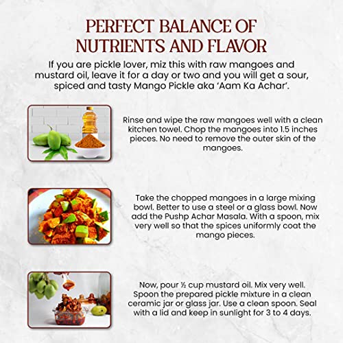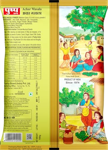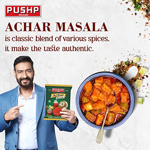 Pushp Achar Masala is a must-have for every Indian kitchen helping you make tasty homemade pickles that make your everyday meals more enjoyable. You can easily make different types of pickles like mango pickle mixed vegetable pickle lemon pickle and many more traditional favorites using this masala. Want to make delicious homemade pickles? Just grab Pushp Achar Masala and create wonderful pickles that your whole family will love! Check out other Pushp masalas too - Garam Masala Kitchen King Chaat Masala Pav Bhaji Masala and many more tasty spice mixes for your Indian cooking.